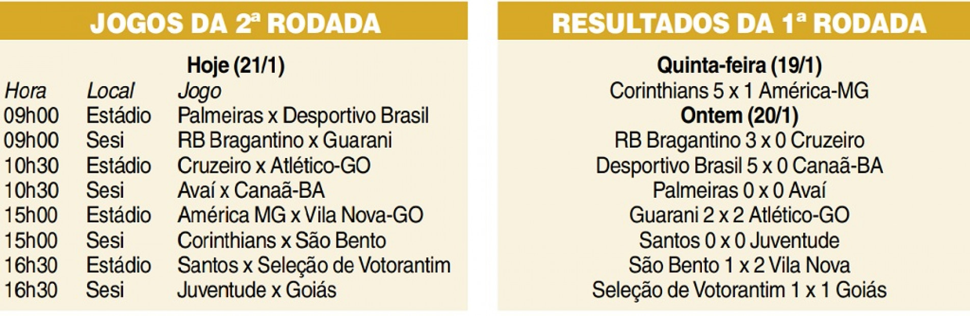 A segunda rodada da competição terá oito jogos hoje (21). Além de Seleção de Votorantim x Santos e América-MG x Vila Nova-GO, o Estádio Municipal receberá Palmeiras x Desportivo Brasil, às 9h, e Cruzeiro x Atlético-GO, às 10h30.
