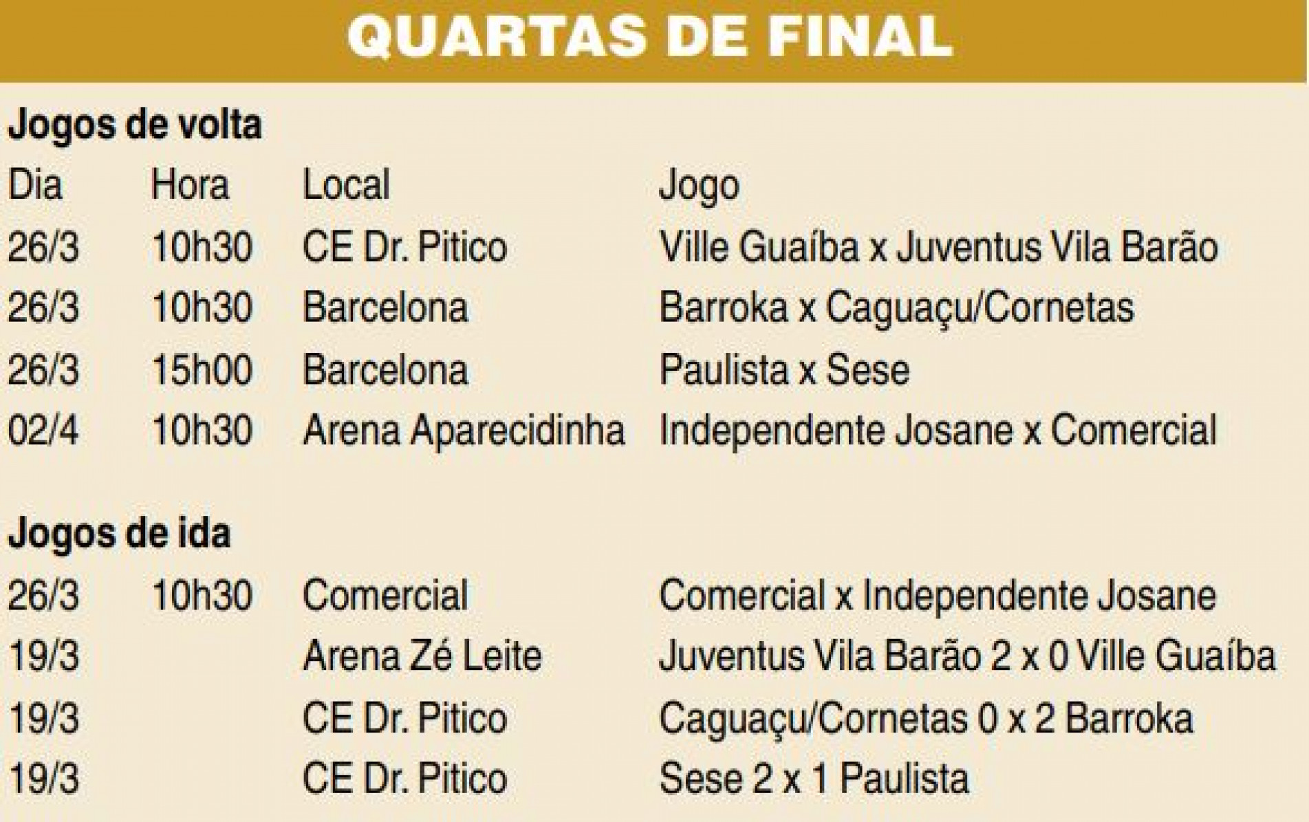 Enquanto isso, Comercial e Independente Josane fazem hoje o confronto de ida e definem no próximo domingo (2/4) o promovido. Além do acesso, os confrontos valem a classificação às semifinais. (Da Redação)