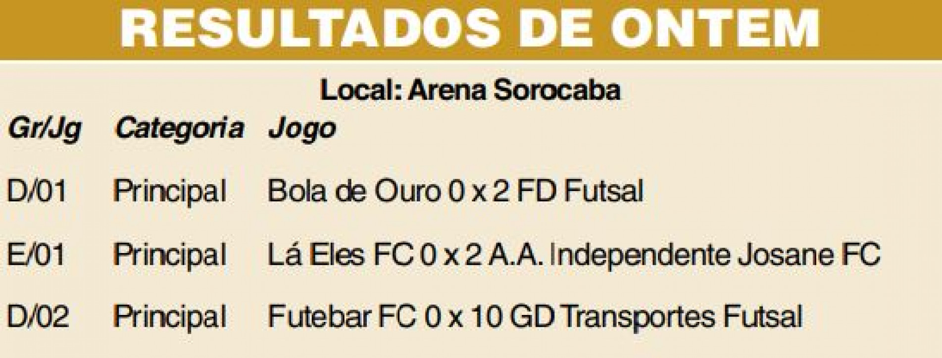 FD Futsal (preto) e A.A. Independente Josane FC fizeram 2 a 0, respectivamente, no Bola de Ouro e no Lá Eles FC. O GD Transportes Futsal protagonizou a primeira goleada desta edição: 10 a 0 no Futebar FC.