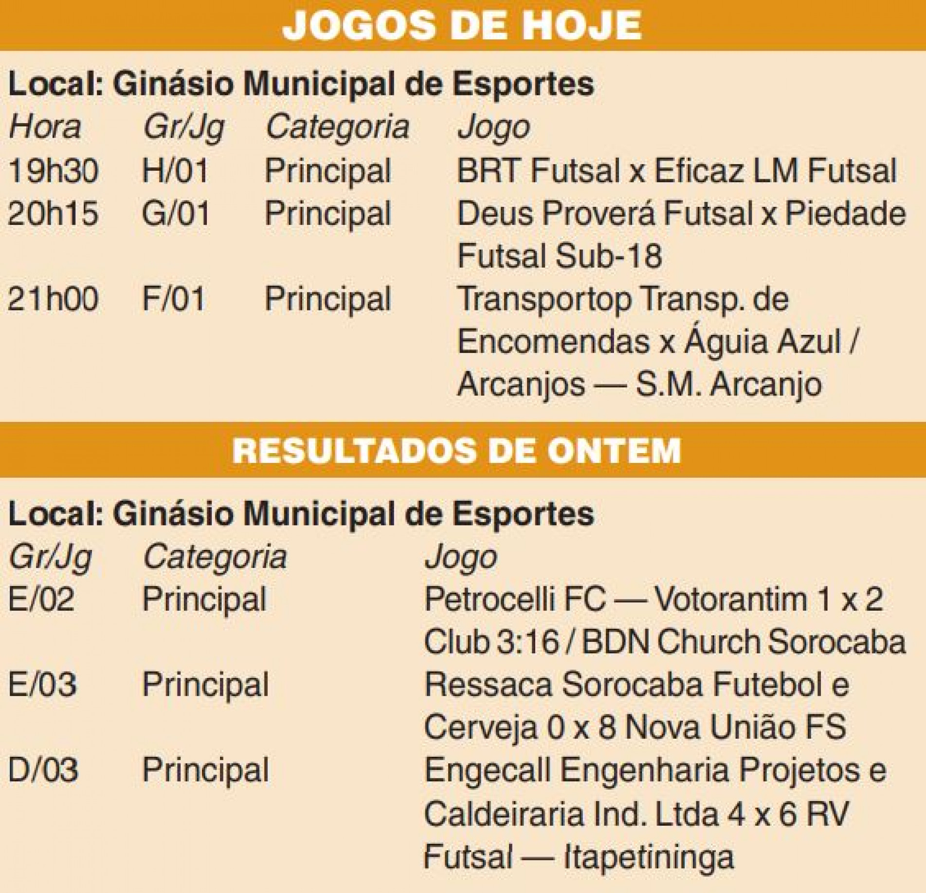 Ontem (29), também no GME, foram realizadas três partidas. Abrindo a noite, o Club 3:16 / BDN Church derrotou o Petrocelli FC de Votorantim por 2 a 1. O Nova União FS goleou o Ressaca Sorocaba Futebol e Cerveja por 8 a 0 e o RV Futsal, de Itapetininga, venceu o Engecall Engenharia Projetos e Caldeiraria Ind. Ltda por 6 a 4, em duelo equilibrado. Ao todo, a primeira semana será fechada com 12 confrontos. (Da Redação)