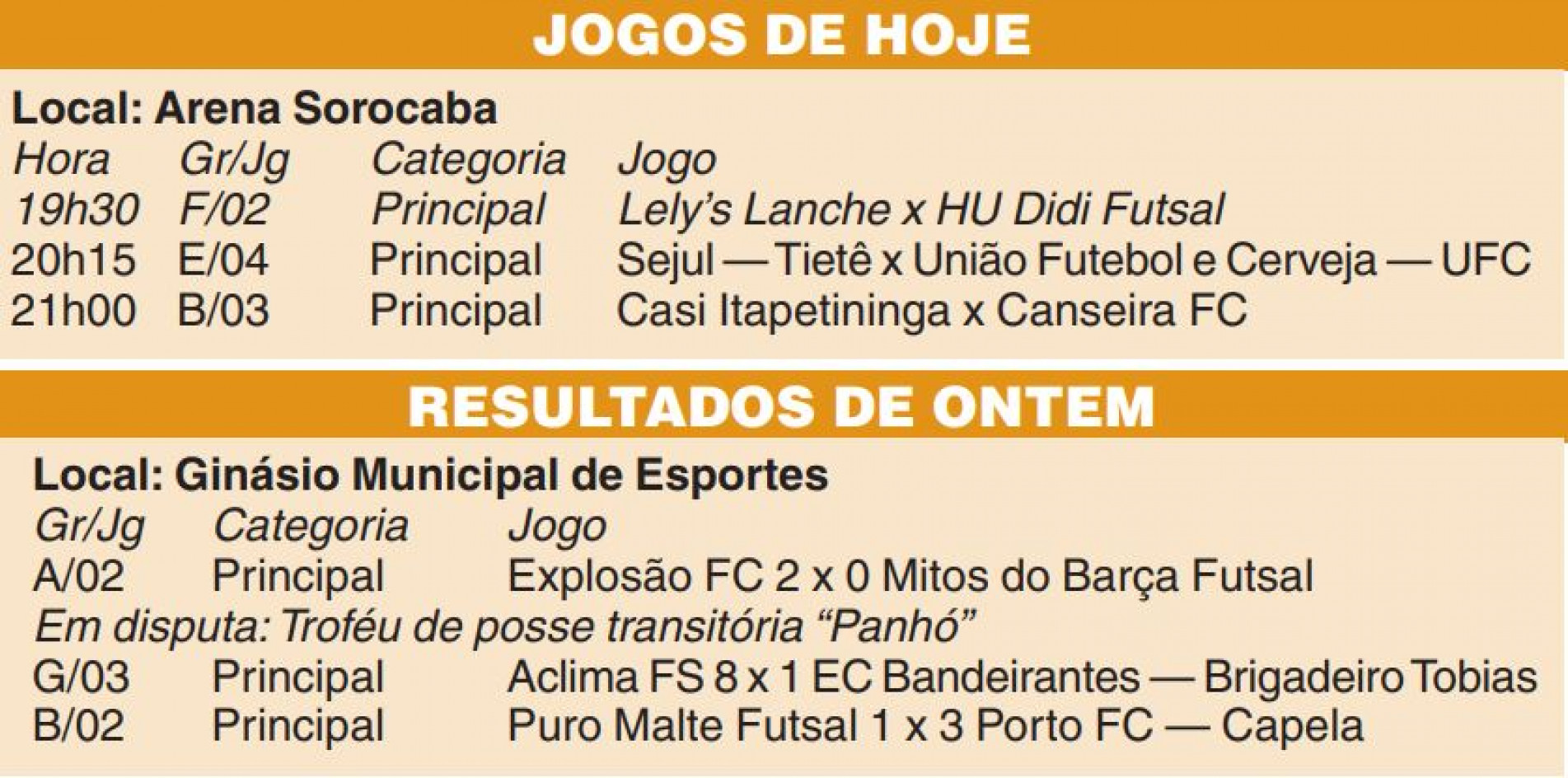 Os jogos de hoje (4) serão na Arena Sorocaba, a partir das 19h30. Todas as partidas da segunda semana, que vai até quinta-feira (6), serão válidas pela categoria Principal. (Da Redação)
