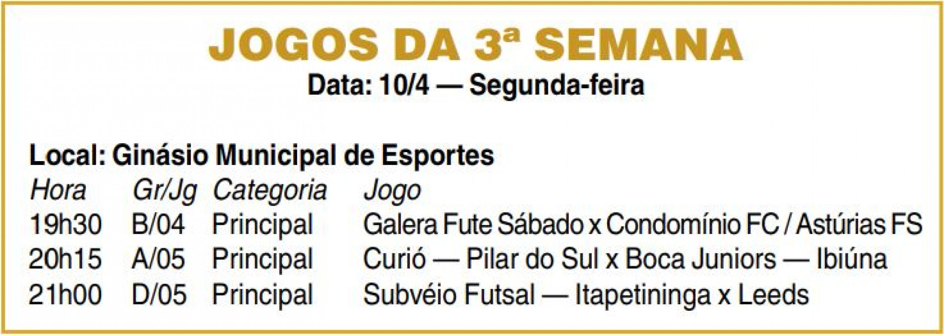 Três jogos abrem amanhã (10) a terceira semana do 64º Torneio Aberto de Futsal Cruzeiro do Sul, o Cruzeirão 2023, no Ginásio Municipal Dr. Gualberto Moreira. Até sexta-feira (14), serão 14 partidas, envolvendo 28 equipes da categoria Principal, sediadas também na Arena Sorocaba e no Ginásio Mirante dos Óvnis, em Votorantim.