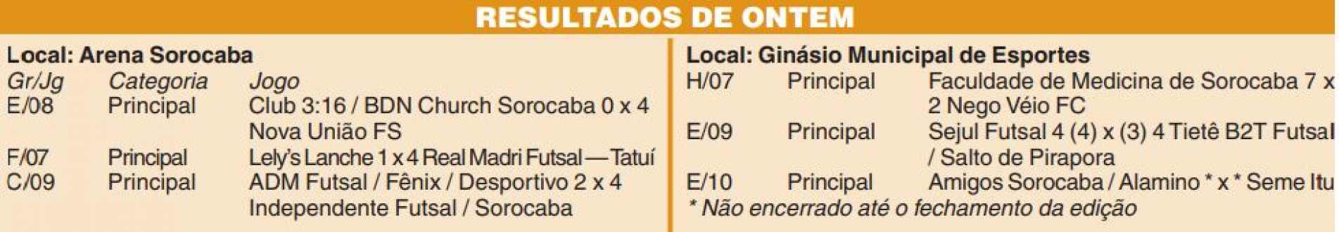 Hoje (25) haverá uma pausa e os jogos serão retomados amanhã (26). Até sexta-feira (28), haverá 15 jogos da categoria Principal, incluindo a estreia de alguns favoritos, como Gaviões Sorocaba, Boca Madella e Coringa de São Roque.