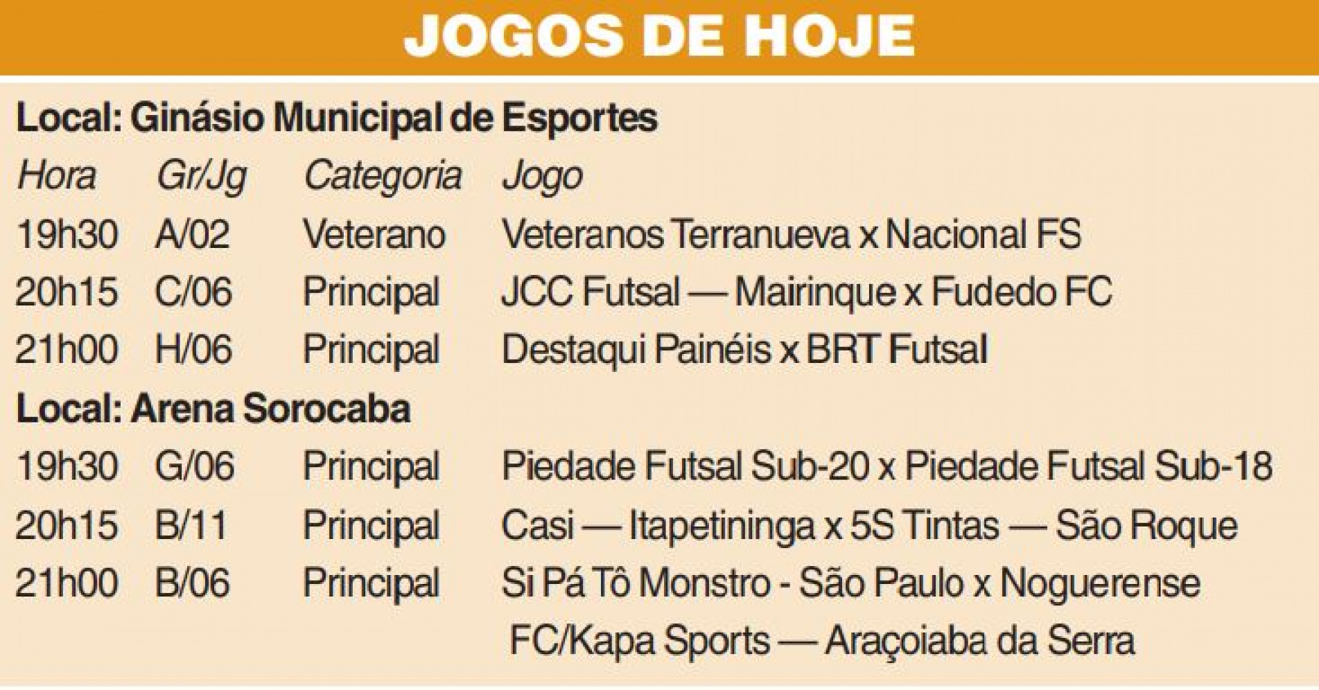 A sexta semana do 64º Torneio Aberto de Futsal Cruzeiro do Sul, o Cruzeirão 2023, termina hoje (5), com seis partidas -- cinco pela categoria Principal e uma pelo Veterano -- sediadas em dois locais: no Ginásio Municipal Dr. Gualberto Moreira e na Arena Sorocaba, a partir das 19h30.