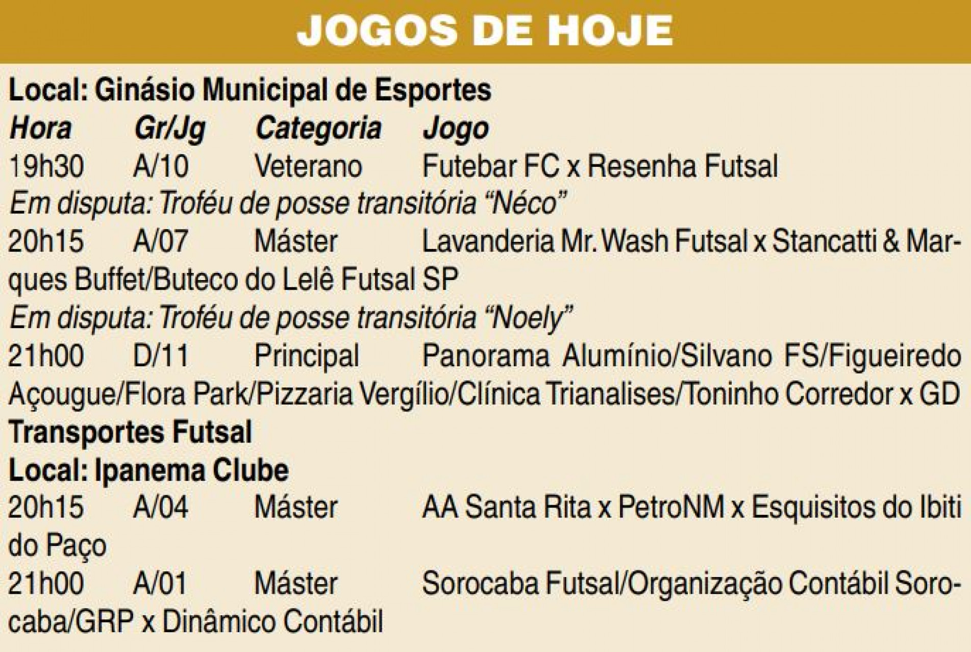 O 64º Torneio Aberto de Futsal Cruzeiro do Sul, o Cruzeirão 2023, terá rodada dupla na noite de hoje (17), com cinco jogos no Ginásio Municipal Dr. Gualberto Moreira (categorias Veterano, Máster e Principal) e no Ipanema Clube (Máster), e dois troféus de posse transitória em disputa: Néco e Noely.