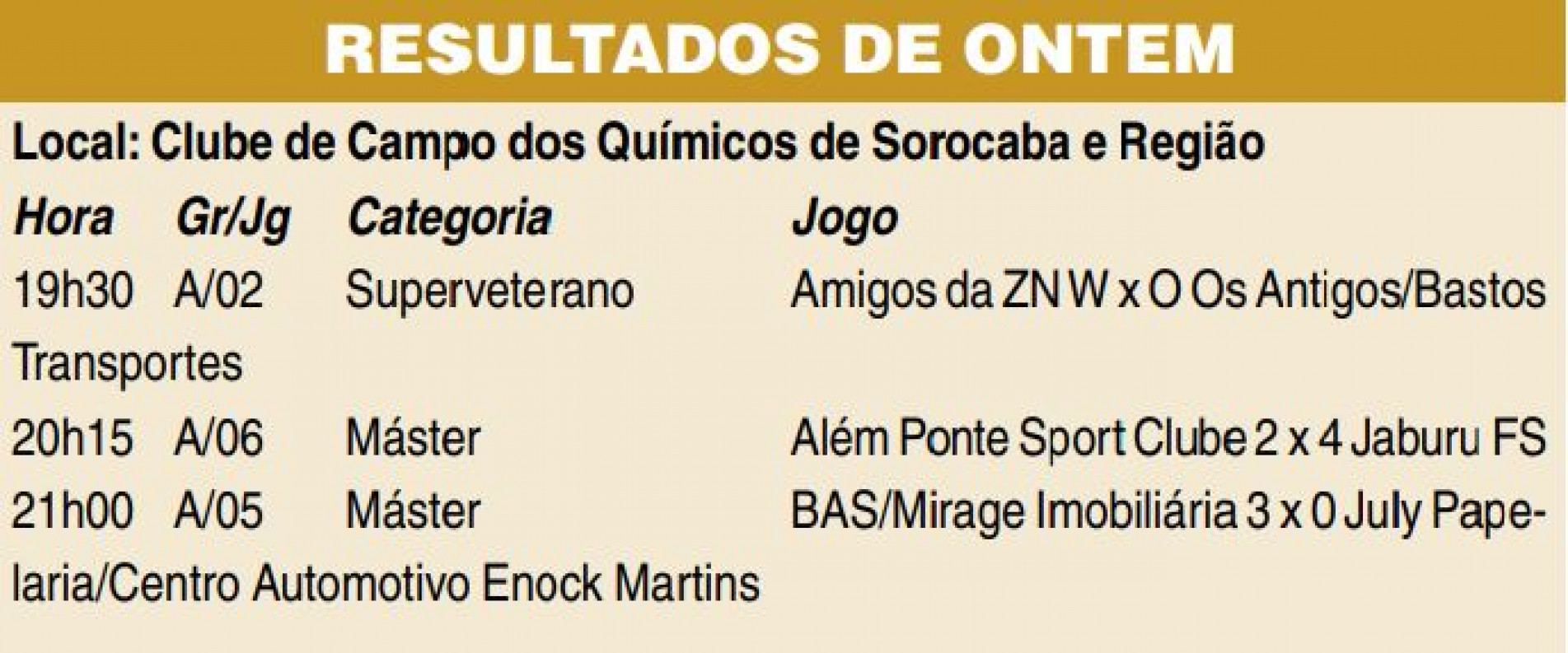 Ontem (16), o Clube de Campo dos Químicos de Sorocaba e Região sediou o pontapé inicial das disputas das categorias Superveterano e Máster. O torneio é realizado pela Secretaria de Esporte e Qualidade de Vida (Sequav), com apoio da Fundação Ubaldino do Amaral (FUA). (Da Redação)