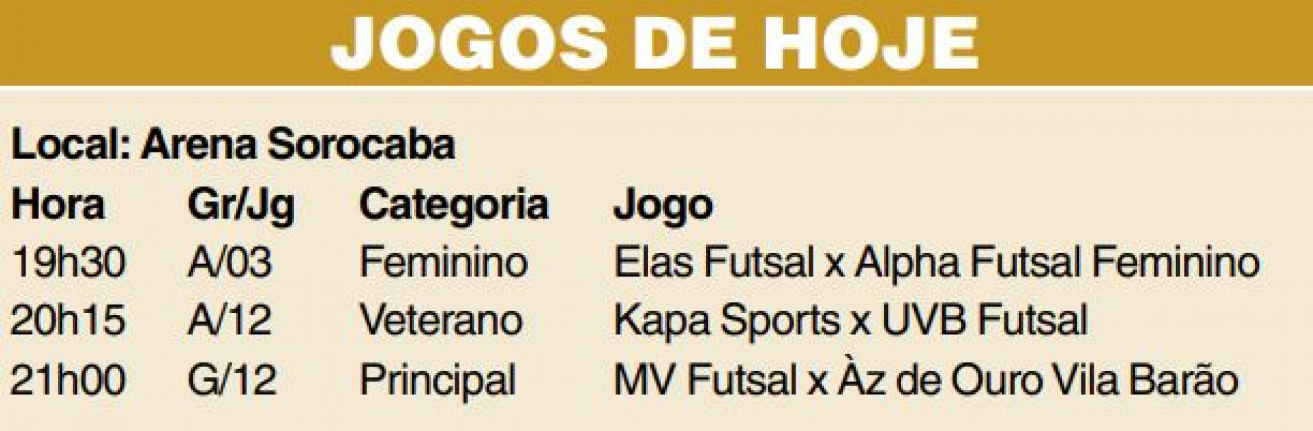 A nona semana será finalizada hoje (26), com três partidas na Arena Sorocaba, a partir das 19h30. O torneio é realizado pela Secretaria de Esporte e Qualidade de Vida (Sequav), com apoio da Fundação Ubaldino do Amaral (FUA). (Da Redação)