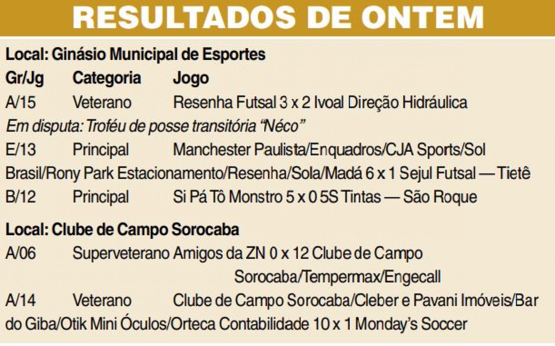 Contando com astros do futsal como Simi, Paulinho Japonês, Tatu e Índio, o Clube de Campo Sorocaba/Tempermax atropelou ontem (25) o Amigos da ZN por 12 a 0, pela categoria Superveterano do 64º Torneio Aberto de Futsal Cruzeiro do Sul, o Cruzeirão 2023. No Veterano, o Clube de Campo Sorocaba/Cleber e Pavani Imóveis também não tomou conhecimento do Monday’s Soccer e venceu por 10 a 1. Os dois jogos foram sediados no ginásio do CCS. No Ginásio Municipal Dr. Gualberto Moreira, outras três partidas movimentaram a noite.