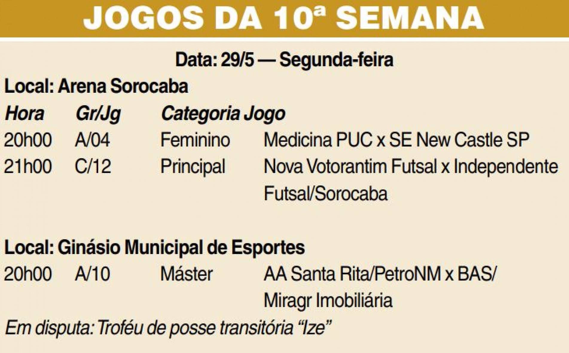 Três jogos em dois ginásios darão início, amanhã (29), à décima semana do 64º Torneio Aberto de Futsal Cruzeiro do Sul, o Cruzeirão 2023. Às 20h, na Arena Sorocaba, Medicina PUC e SE New Castle SP decidem quem será o último semifinalista do Feminino. Na sequência, às 21h, o jogo entre Nova Votorantim Futsal e Independente Futsal/Sorocaba classifica o ganhador para as quartas de final do Principal.