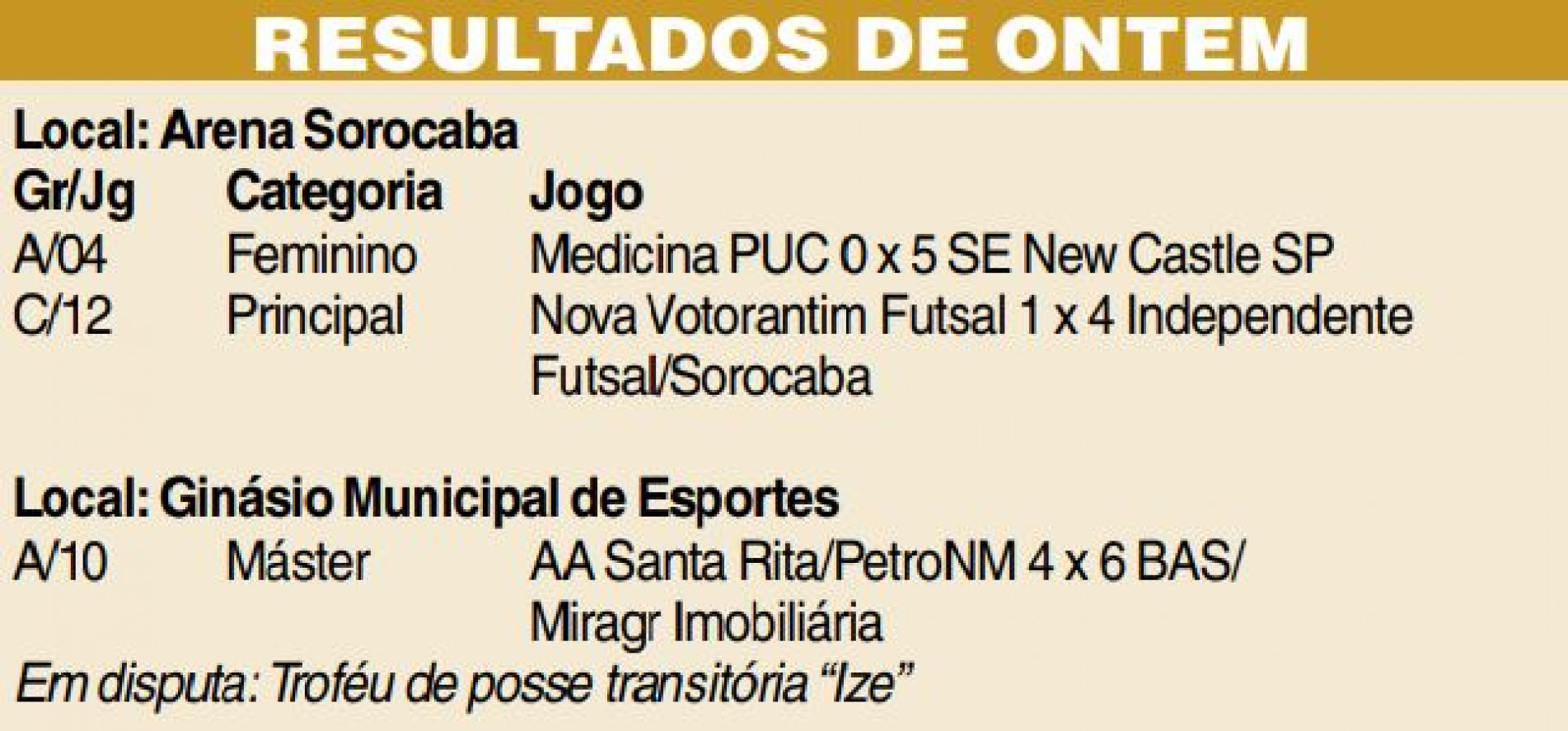 Também hoje, às 20h, no GME, Bar do Zé/Gobi Tabacaria e GE Santa Terezinha/Boca Madella medem forças valendo um lugar na semi do Superveterano. Ontem, pelo Máster, o BAS/Miragr Imobiliária superou o AA Santa Rita/PetroNM por 6 a 4, avançou às quartas e ficou com a posse transitória do troféu “Ize”. O Feminino teve a classificação do SE New Castle SP sobre o Medicina PUC, por 5 a 0, na Arena. O torneio é realizado pela Secretaria de Esporte e Qualidade de Vida (Sequav), com apoio da Fundação Ubaldino do Amaral (FUA). (Da Redação)