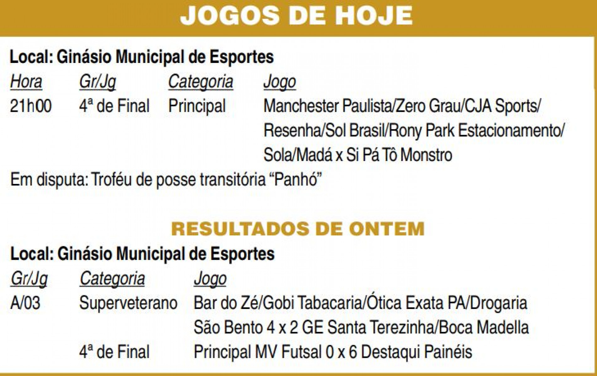Já o Bar do Zé/Gobi Tabacaria fez 4 a 2 no GE Santa Terezinha/Boca Madella, indo à semi do Superveterano. O torneio é realizado pela Secretaria de Esporte e Qualidade de Vida (Sequav), com apoio da Fundação Ubaldino do Amaral (FUA). (Da Redação)