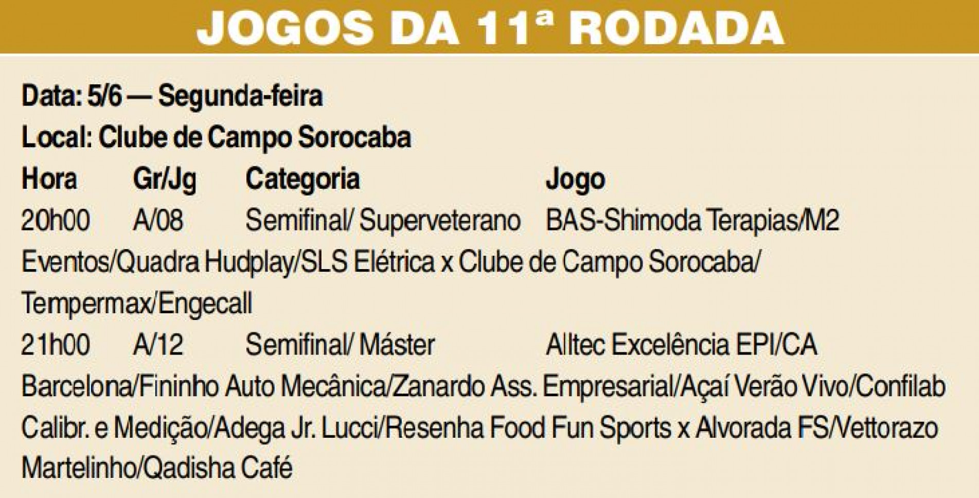 Quatro categorias têm os postulantes ao título em aberto: Principal, Superveterano, Máster e Feminino. O Veterano já decidiu os finalistas: KFC/Panorâmico e Clube de Campo Sorocaba. O torneio é realizado pela Secretaria de Esporte e Qualidade de Vida (Sequav), com apoio da Fundação Ubaldino do Amaral (FUA). (Da Redação)