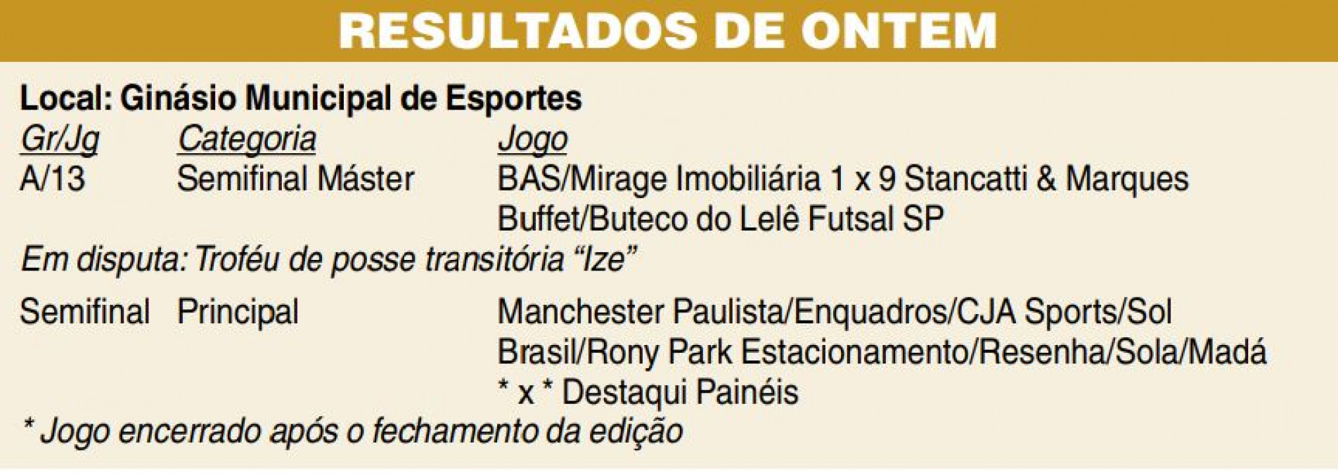 Pela semifinal do Máster, com grande exibição de Simei Lamarca, o Stancatti & Marques Buffet fez 9 a 1 no BAS/Mirage Imobiliária e vai disputar a taça contra o Alltec/CA Barcelona. O jogo que definiu o adversário do Manchester Paulista/Zero Grau na decisão do Principal, entre Manchester Paulista/Enquadros e Destaqui Painéis, não foi encerrado até o fechamento da edição.
