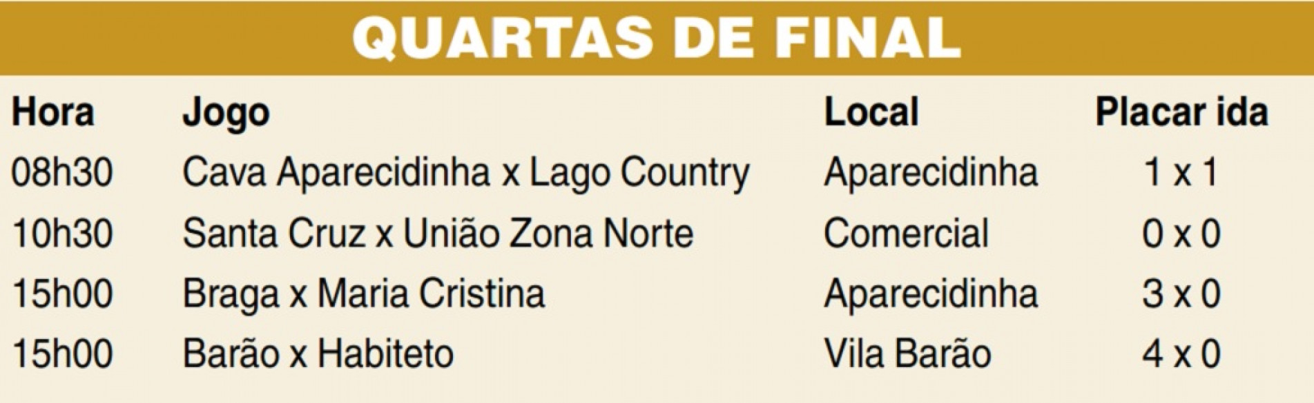 As disputas entre União Zona Norte e Santa Cruz estão abertas, assim como Lago Country e Cava Aparecidinha. Os times empataram nos jogos de ida e nova igualdade provocará a decisão por pênaltis. (Da Redação)