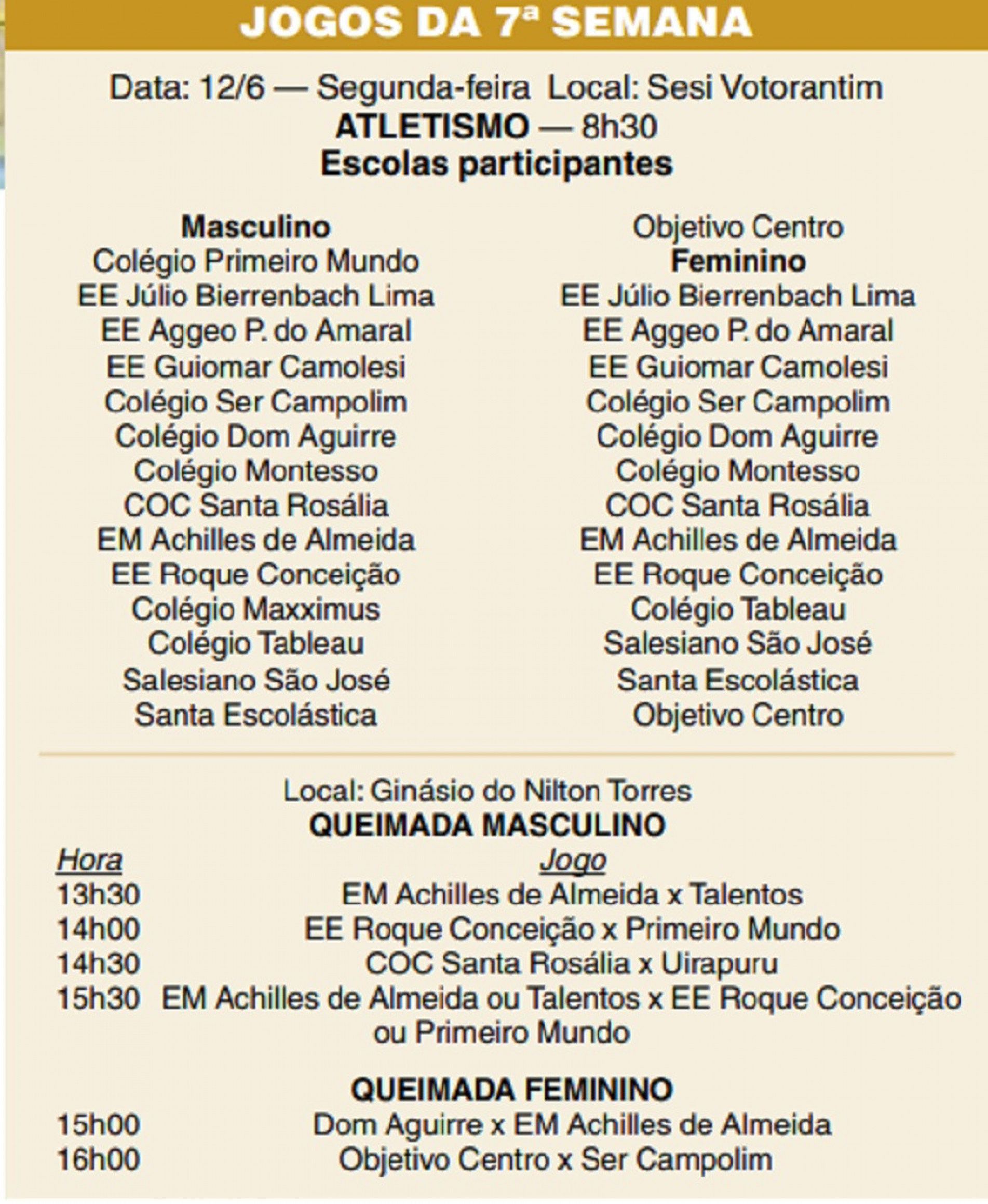 À tarde, a partir das 13h30, no Ginásio do Nilton Torres, haverá seis jogos de queimada. Organizados pela Secretaria de Esporte e Qualidade de Vida (Sequav), os JES têm patrocínio do McDonald’s e do Centro Universitário Facens. (Da Redação)