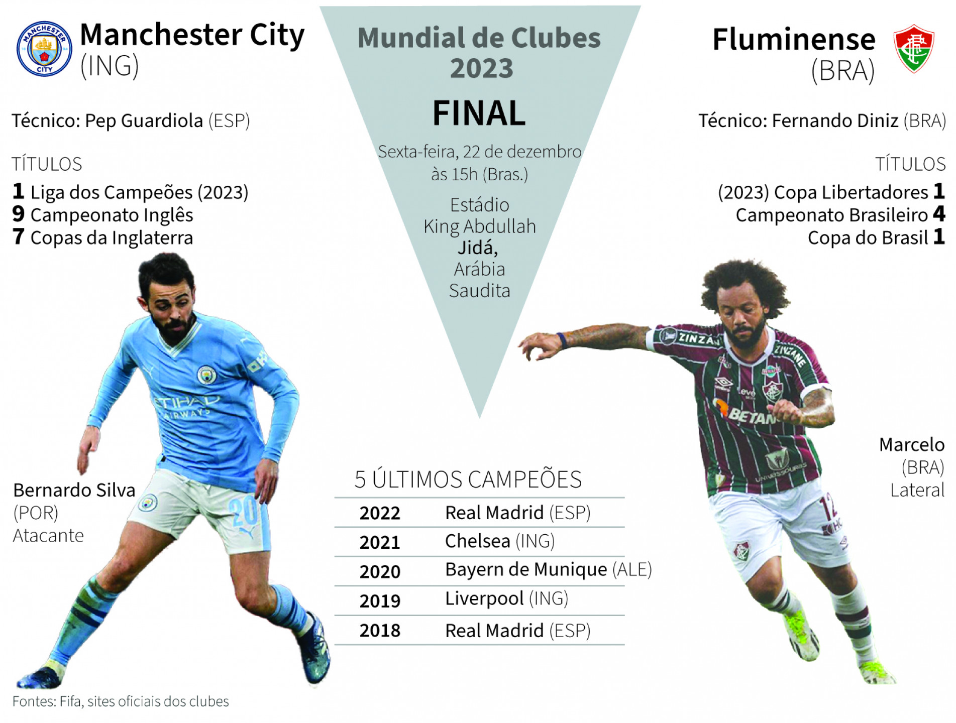 Em busca do tão sonhado título do Mundial de Clubes da Fifa, o Fluminense enfrenta o Manchester City, vencedor da Liga dos Campeões da Europa, hoje (22), às 15h, no estádio Rei Abdullah, em Jeddah, na Arábia Saudita. Em caso de empate no tempo normal, o campeão inédito pode sair da prorrogação de 30 minutos, com dois tempos de 15, ou das cobranças de pênaltis.