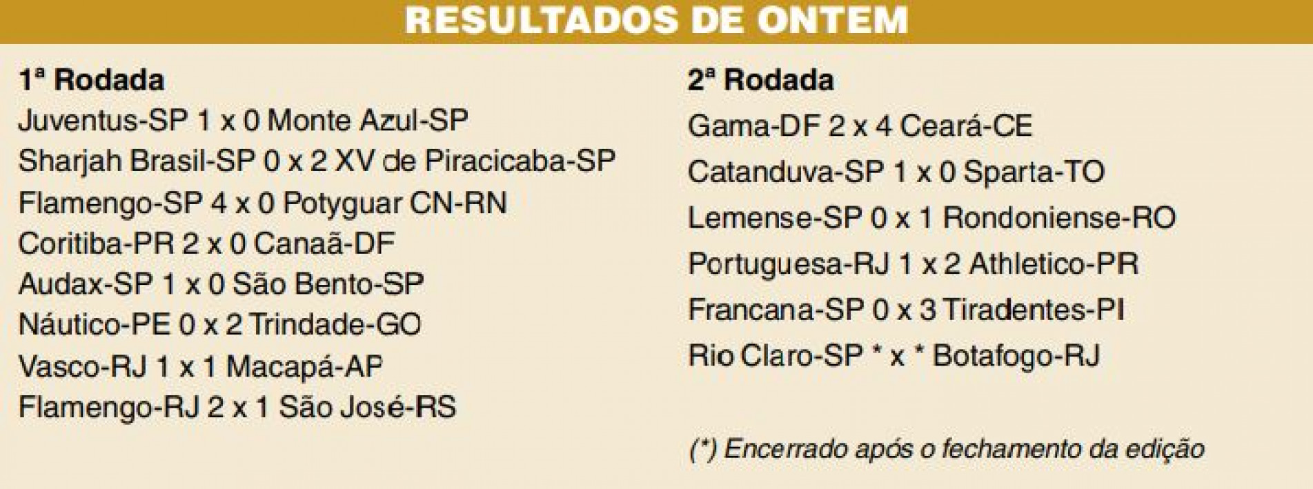 Já o Ceará, líder do Grupo 8, com seis pontos, confirmou a vaga graças ao triunfo do Rondoniense por 1 a 0 diante do Lemense, em Leme. Gama e Rondoniense, com três, se enfrentam na última rodada. O Lemense, que já não tem mais chance de classificação, tem zero. (Da Redação)
