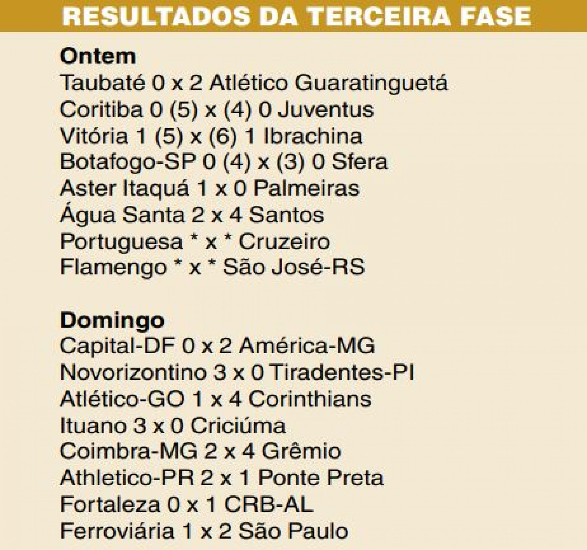 Mais cedo, Coritiba, Ibrachina-SP e Botafogo-SP avançaram às oitavas de final, eliminando Juventus, Vitória e Sfera-SP, respectivamente.