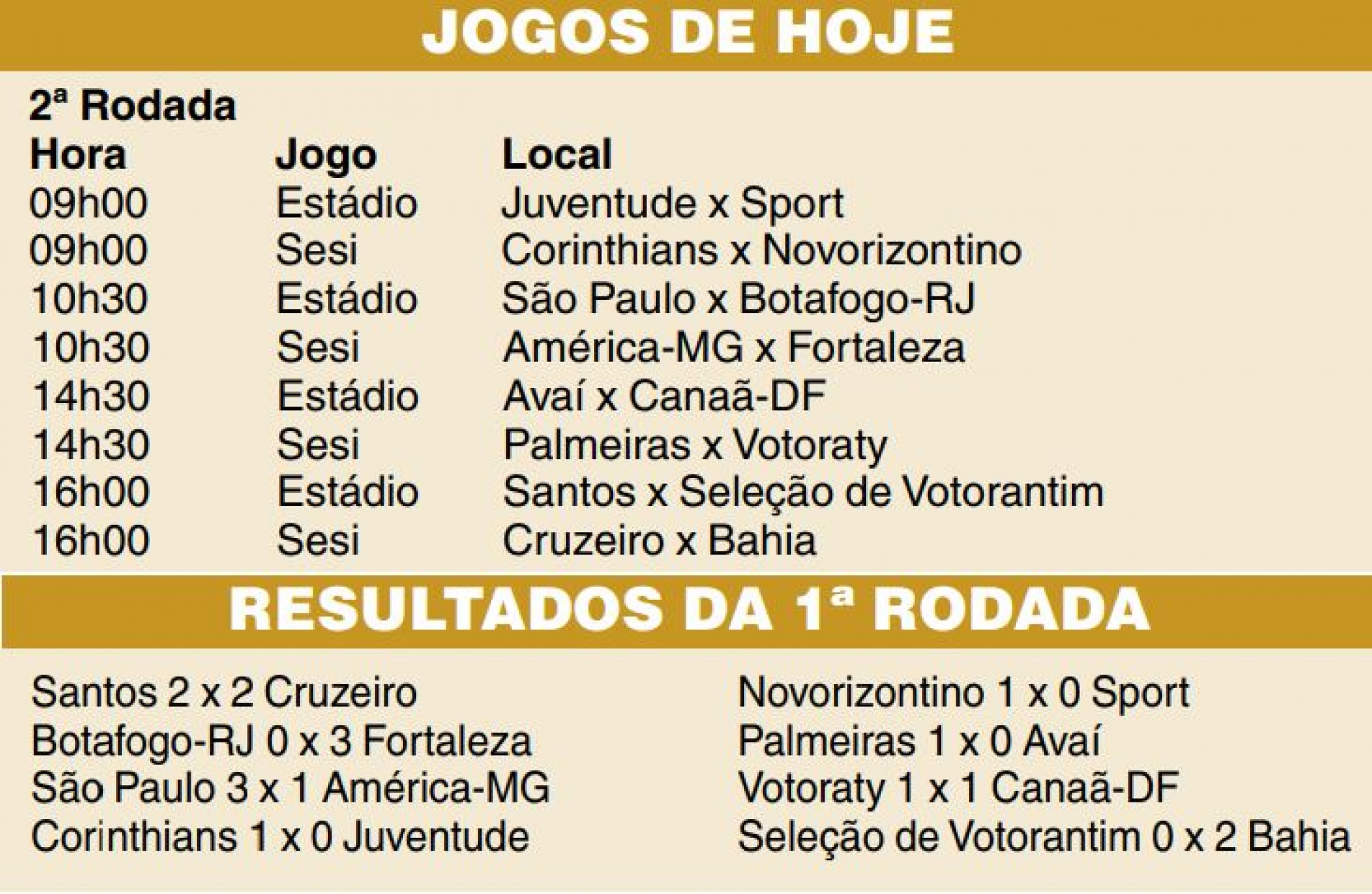 Pelo Grupo D, no Sesi, o São Paulo ganhou do América-MG por 3 a 1. O Expressinho Tricolor abriu o placar aos nove minutos, com Gustavo. O segundo saiu após um gol contra de Van Mota. Na segunda etapa, o América-MG diminuiu aos 22 minutos, com Lucas, e Brenno ampliou perto do fim. O Tricolor enfrenta hoje o Botafogo-RJ, às 10h30, no Domênico.