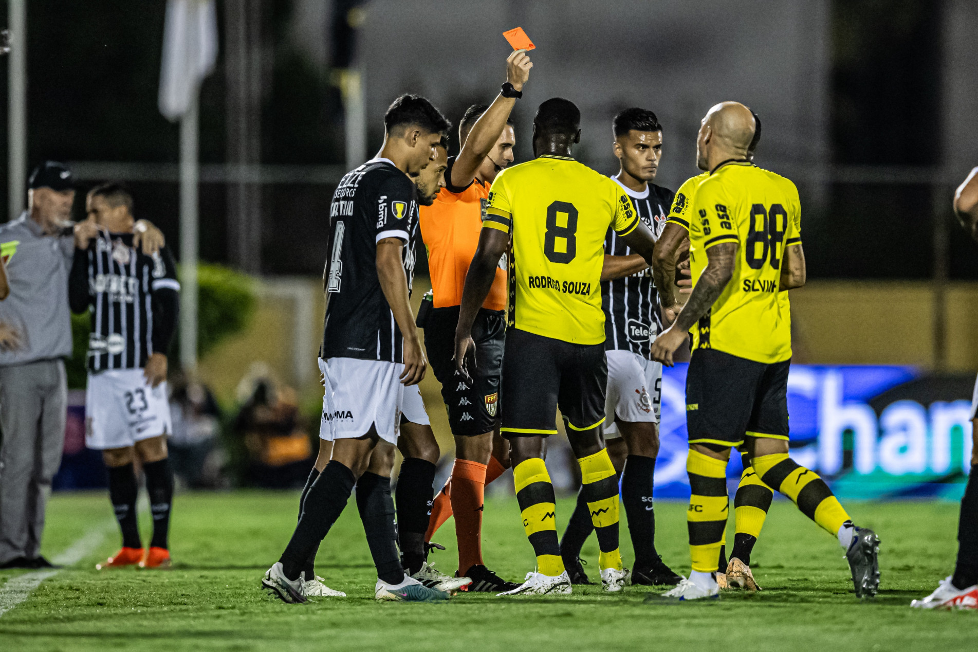 O São Bernardo teve Rodrigo Souza expulso logo aos 13 minutos, por causa de carrinho em Rojas. A decisão foi tomada após consulta ao monitor do VAR. Os corintianos, então, melhoraram no jogo. Até que Rojas perdeu a bola no meio e permitiu o avanço do São Bernardo com Tocantins. Ele atraiu três marcadores e soltou a bola para Lucas Lima enfiar nas costas de Palácios. Vitor Ricardo recebeu e encontrou Silvinho, livre pela direita, para colocar na rede.