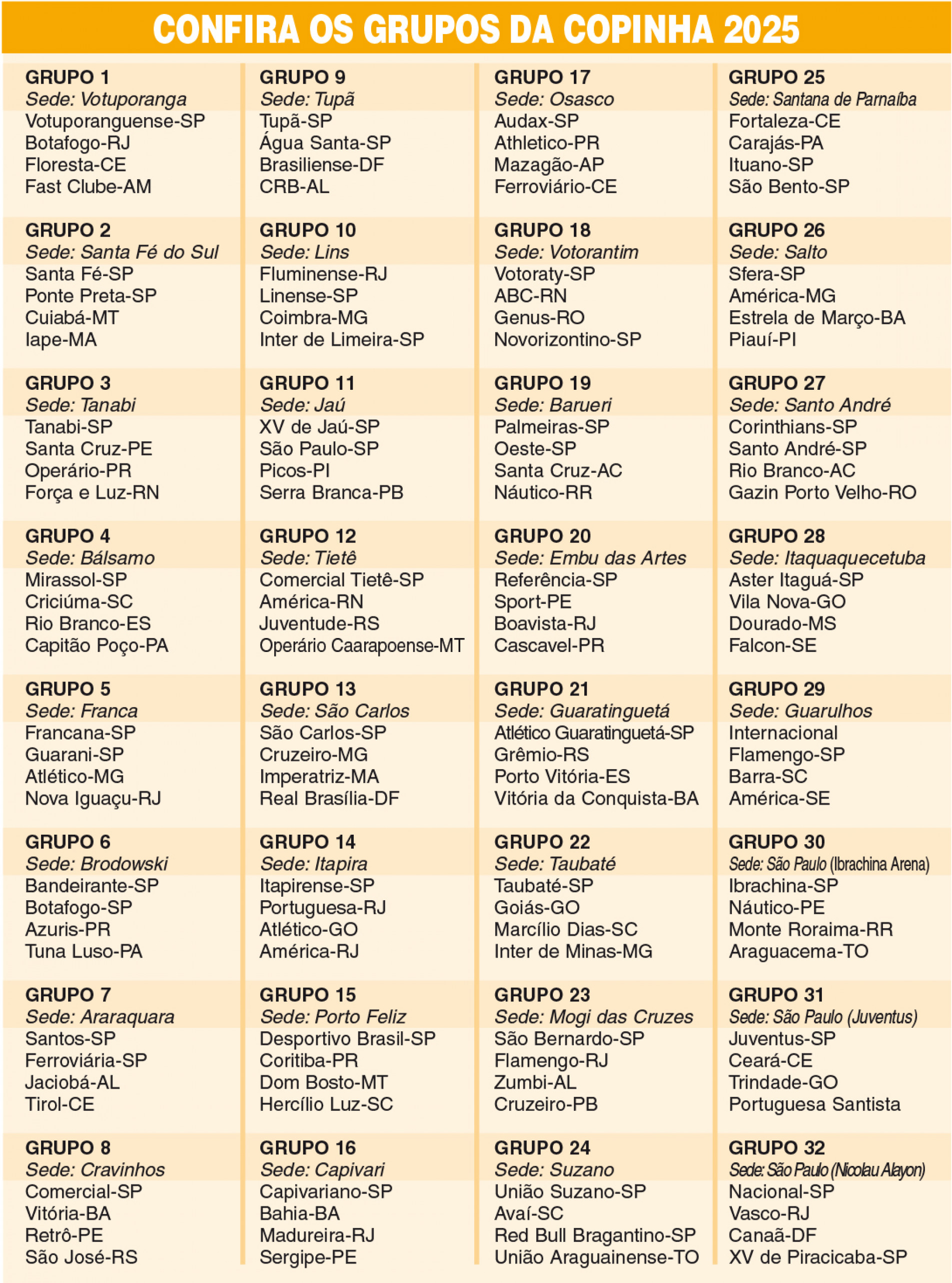O Santos, por sua vez, aparece no Grupo 7, em Araraquara, que também é composto por Ferroviária, Jaciobá-AL e Tirol-CE. Por fim, o São Paulo, dono de quatro títulos, irá jogar em Jaú na primeira fase, ao lado do XV de Jaú, Picos-PI e Serra Branca-PB. (Com informações do Estadão Conteúdo)