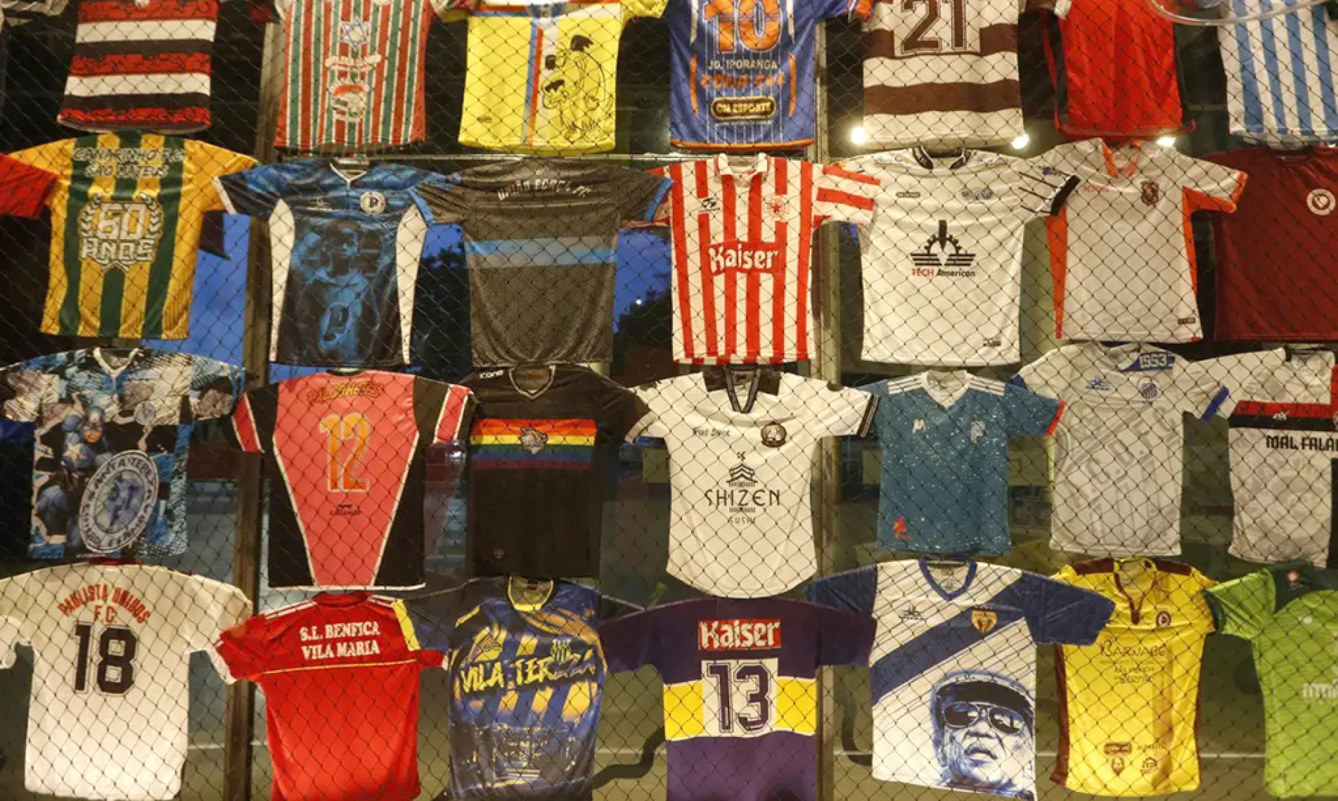 Uma instalação especial reúne dezenas de camisas dos times, de acervos dos curadores e de personalidades da várzea.