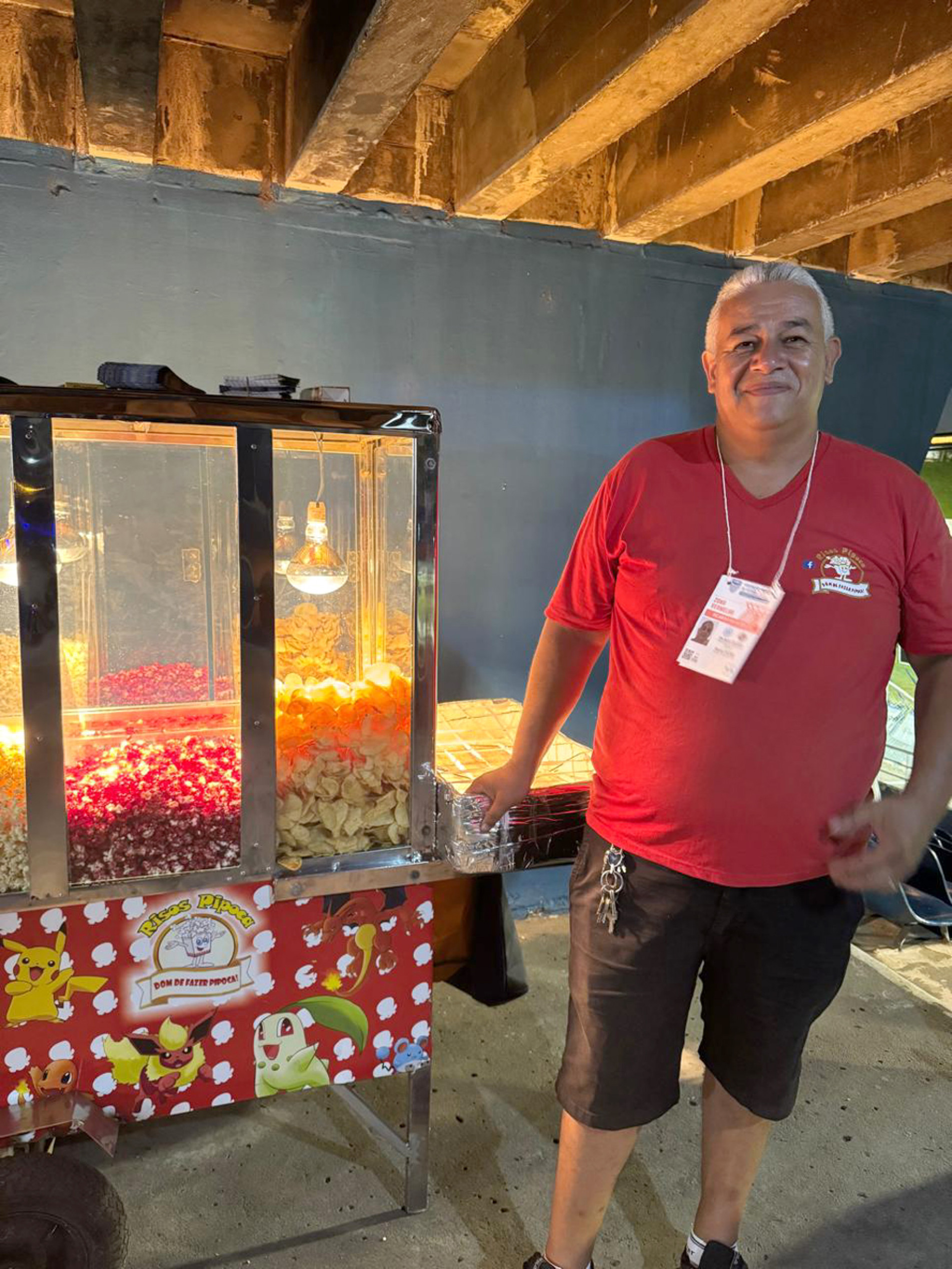 Seja salgada ou doce, é do carrinho do Ricardo Silva Santos, de 48 anos, que sai a pipoca que faz sucesso dentro do estádio. A cada jogo são, em média, 150 cones. “Aqui eu fico de um lado, meu filho do outro, e o público é muito bom. Estou aqui há dois anos e não penso em parar, não. O dinheiro agrega e, aos poucos, a gente vai realizando alguns sonhos sim”, comenta o microempreendedor.