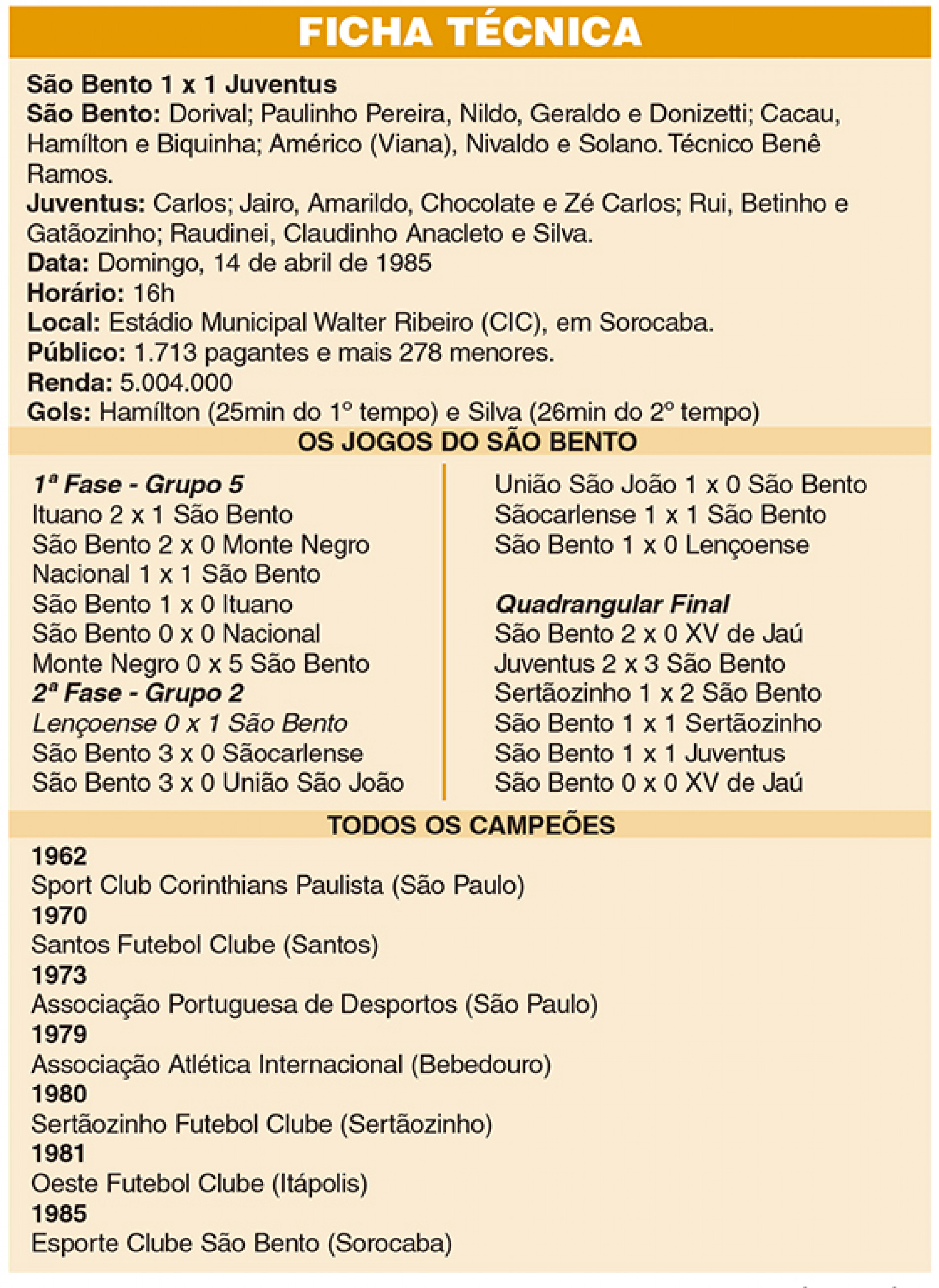 Os torcedores que estavam presentes no Estádio Municipal Walter Ribeiro, o CIC, em 19 de abril de 1985, acompanharam o empate sem gols diante do XV de Jaú. Contudo, o São Bento já tinha garantido o título com uma rodada de antecedência — no dia 14, também no CIC, mais de 1,7 mil são-bentistas vibraram com o empate por 1 a 1 contra o Juventus, resultado suficiente para que o Bentão soltasse o grito de “é campeão”.