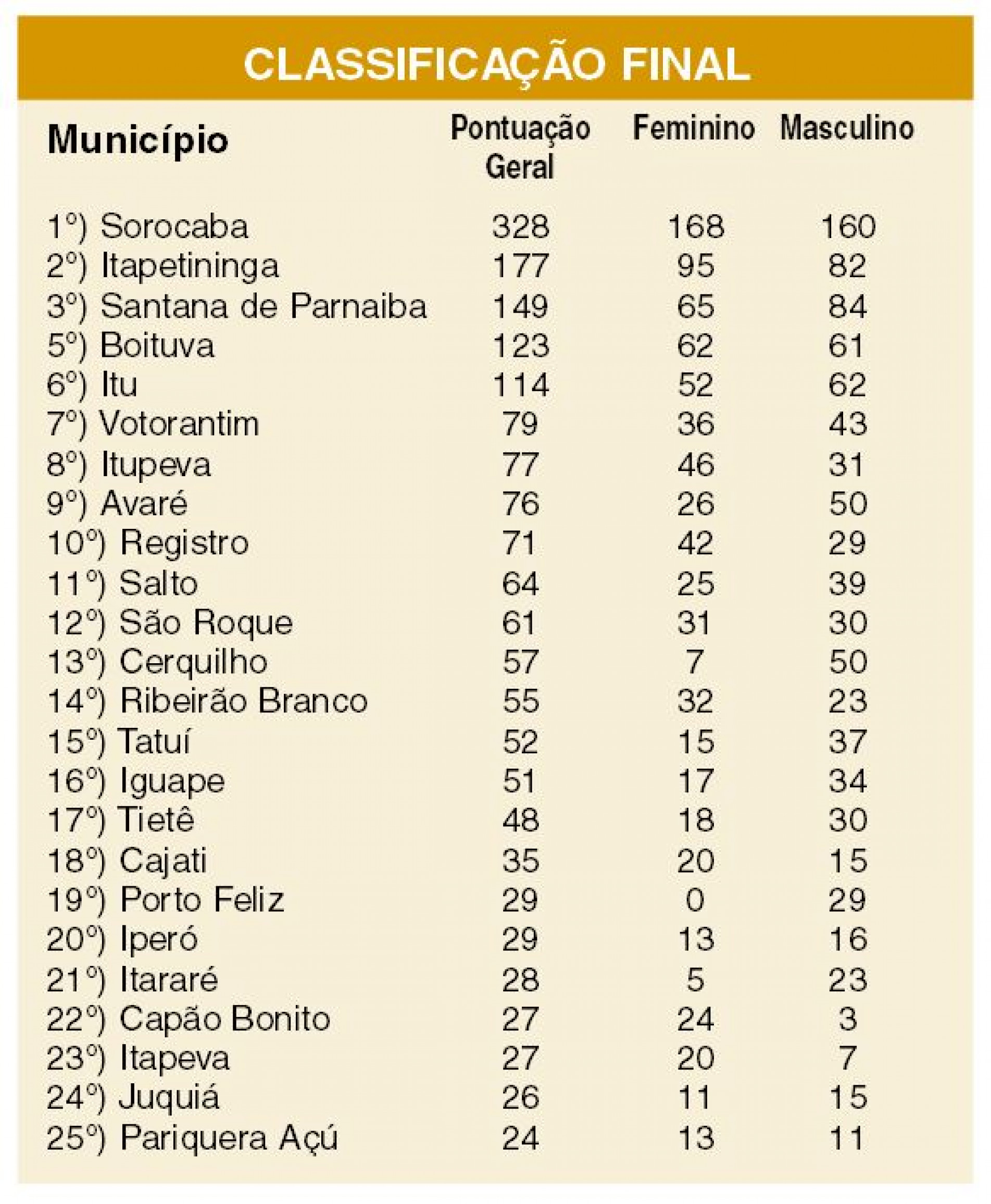 Na classificação geral, a delegação sorocabana, composta por cerca de 400 atletas, saiu dos Regionais com 328 pontos, sendo 168 no feminino e 160 no masculino. Completam o top 3 as cidades de Itapetininga (177 pontos) e Santana de Parnaíba (149 pontos). Votorantim, por sua vez, terminou em sétimo lugar com 79 pontos.