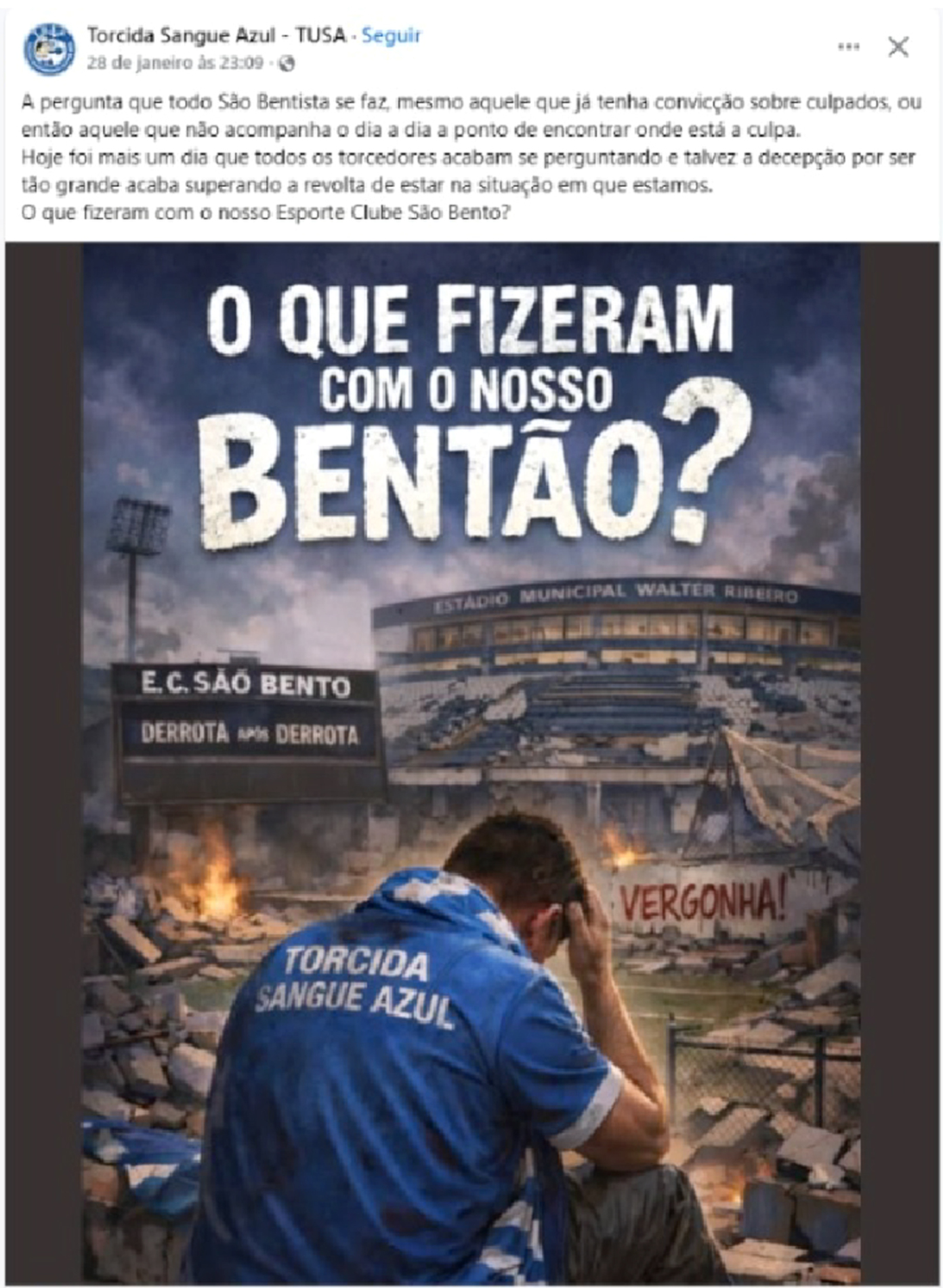A principal torcida organizada do clube, a Torcida Uniformizada Sangue Azul (Tusa), protestou contra a atual situação da equipe. Em publicação nas redes sociais, os torcedores demonstraram que, diante do momento vivido pelo São Bento, a decepção tem sido maior do que a revolta. A postagem deixou no ar o questionamento: “O que fizeram com o nosso Esporte Clube São Bento?”. A manifestação se deu após a derrota em casa por 1 a 0 para o São José, na noite de 28 de janeiro.