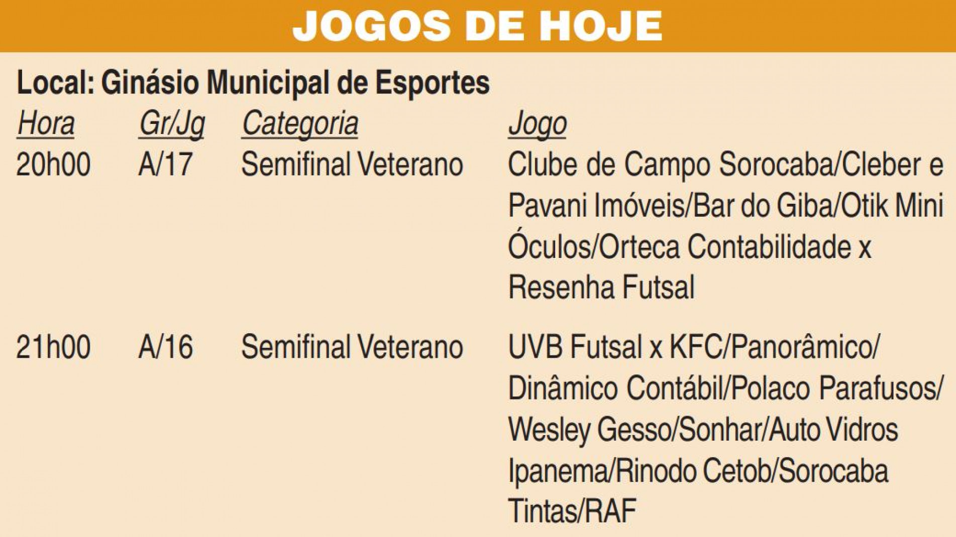 O 64º Torneio Aberto de Futsal Cruzeiro do Sul, o Cruzeirão 2023, conhecerá hoje (1º) os primeiros postulantes ao título. Às 20h, no Ginásio Municipal Dr. Gualberto Moreira, pela categoria Veterano, vão se enfrentar UVB Futsal e KFC Panorâmico, assim como Clube de Campo Sorocaba e Resenha Futsal, às 21h. Ambos os jogos valem classificação para a final.