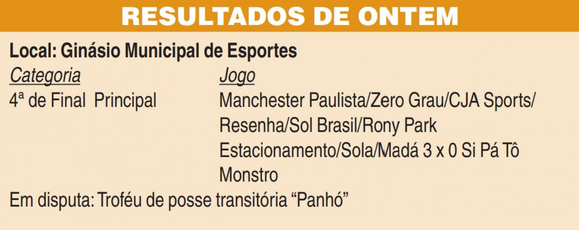 Ontem (31), também no GME, o Manchester Paulista/Zero Grau tornou-se o segundo classificado à semifinal do Principal ao superar o Si Pá Tô Monstro por 3 a 0 e ainda seguiu com a posse transitória do troféu “Panhó”. O torneio é realizado pela Secretaria de Esporte e Qualidade de Vida (Sequav), com apoio da Fundação Ubaldino do Amaral (FUA). (Da Redação)