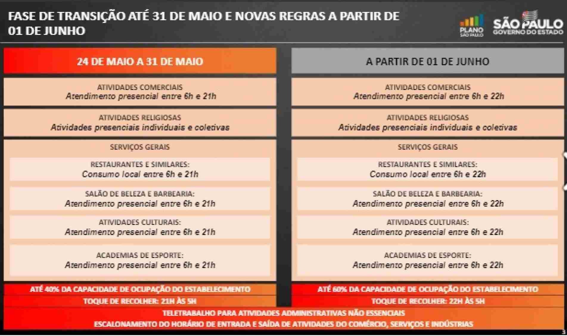 A partir de 24 de maio, a ocupação poderá subir de 30% para 40%. Doria chamou a mudança de uma "nova fase" da fase de transição. Com a mudança, o toque de recolher passará a valer entre as 22h e 5h, diariamente.