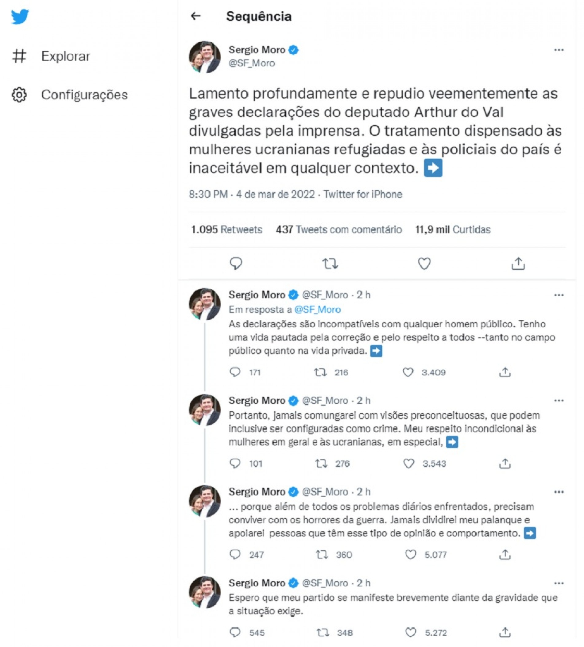 “O tratamento dispensado às mulheres ucranianas refugiadas e às policiais do país é inaceitável em qualquer contexto. As declarações são incompatíveis com qualquer homem público”, destaca Moro.