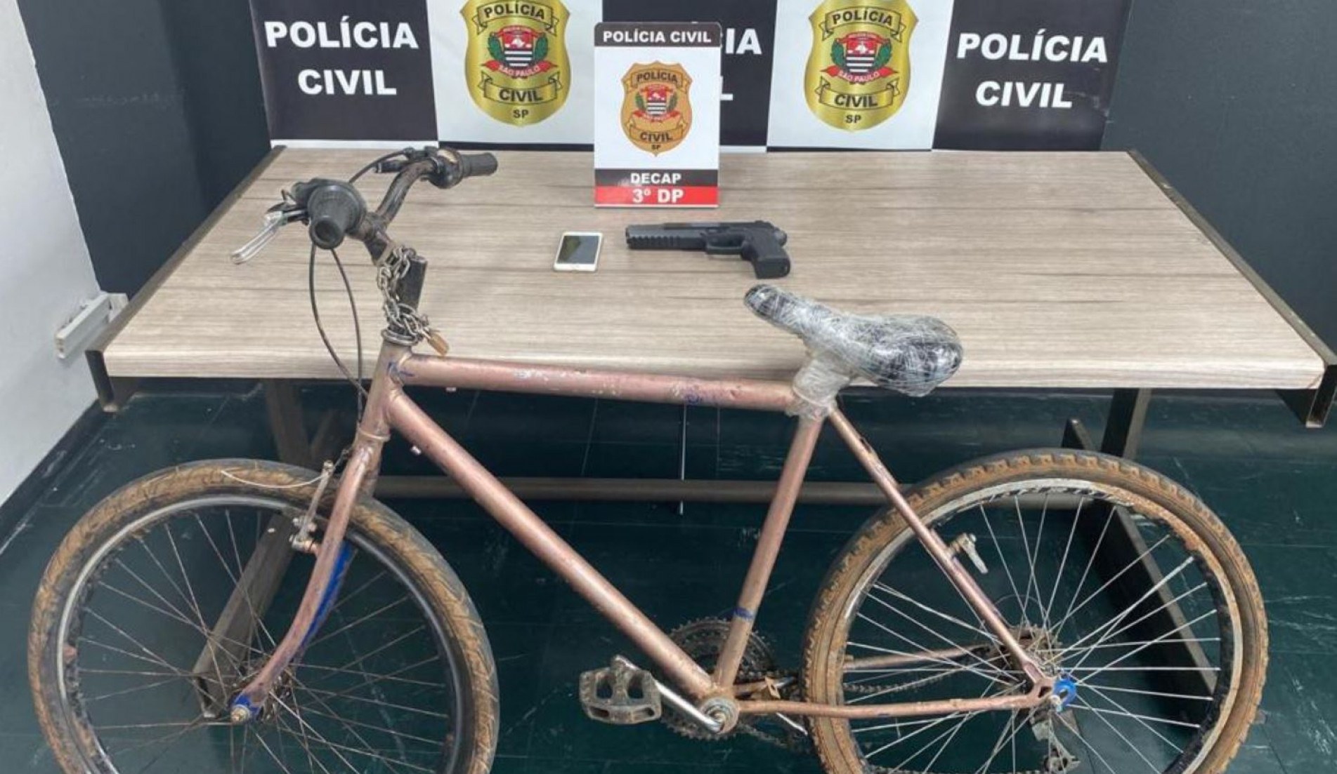 Com o homem foi localizado o celular da vítima, bem como um simulacro de arma de fogo e uma bicicleta