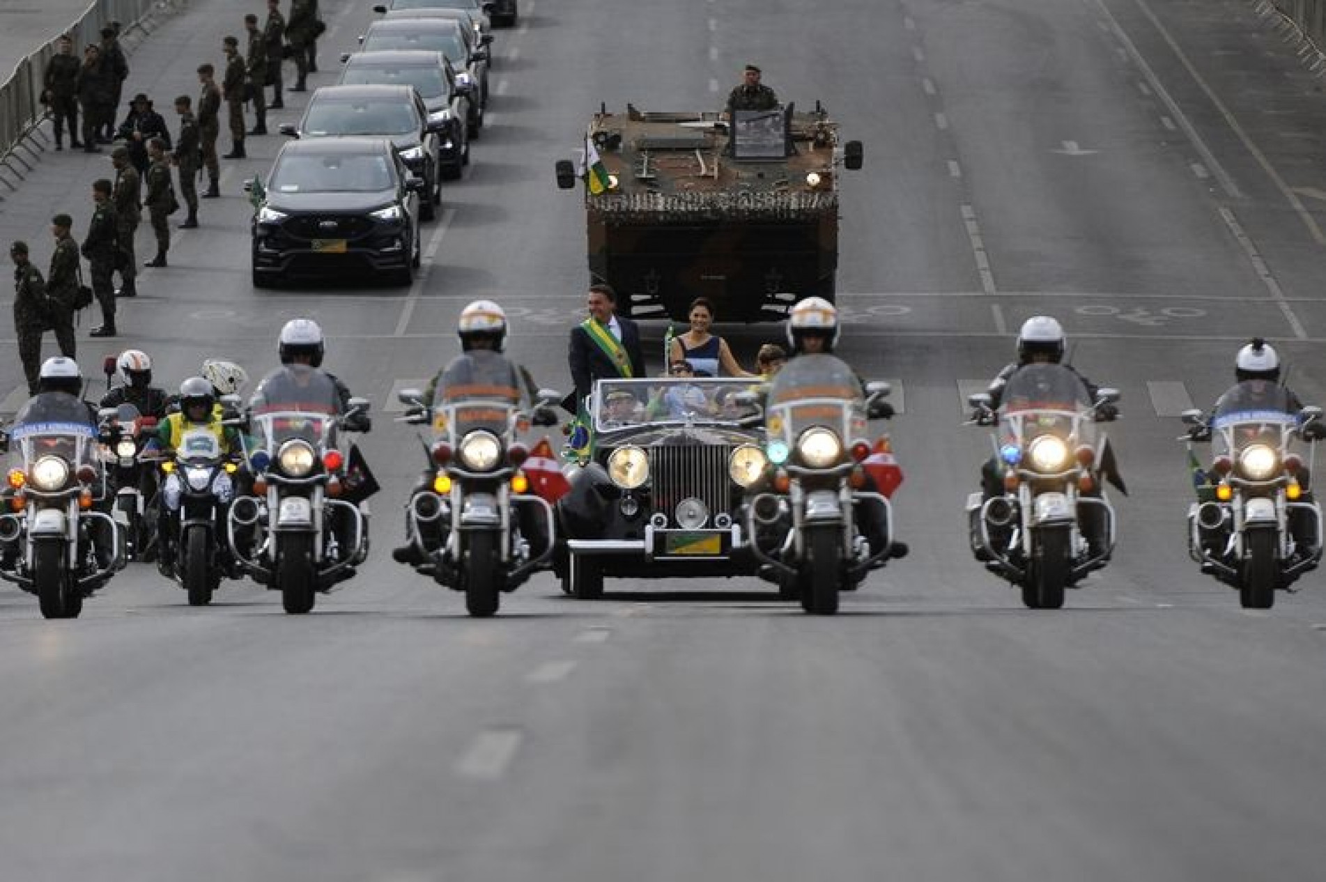 Perto das 9h, o presidente da República, Jair Bolsonaro, chegou. Antes de ir para a tribuna, o presidente quebrou o protocolo e decidiu caminhar pela pista, acenando para as arquibancadas, repletas de apoiadores. Nesse momento, paraquedistas do Exército desceram na Esplanada trazendo uma bandeira do Brasil. Em seguida, o presidente ocupou seu lugar na tribuna para o início do desfile, que foi marcado pela passagem da Esquadrilha da Fumaça. Os aviões cortaram o céu da Esplanada e deixaram um rastro de fumaça nas cores da Bandeira Nacional.