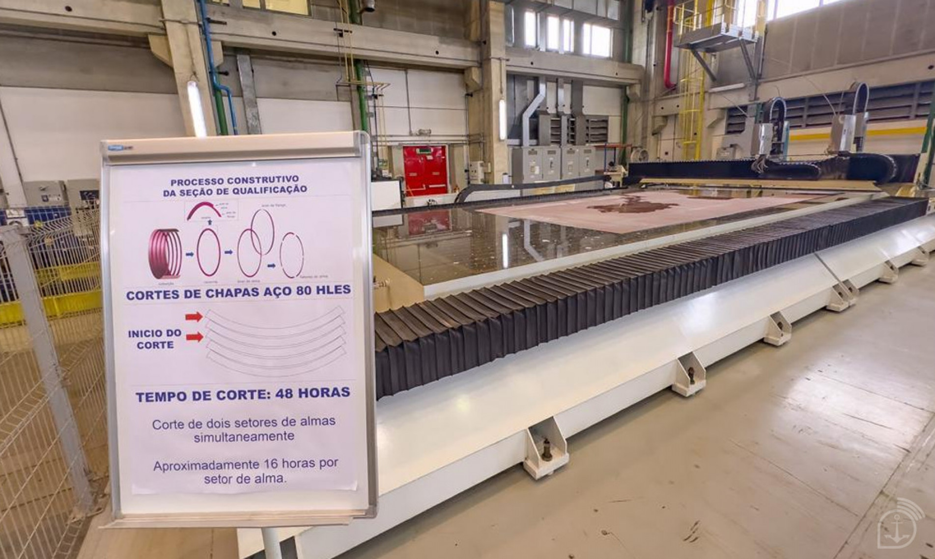 O corte da primeira chapa, marco significativo do processo construtivo, representa o início da confecção da estrutura que compõe a chamada 'Seção de Qualificação'