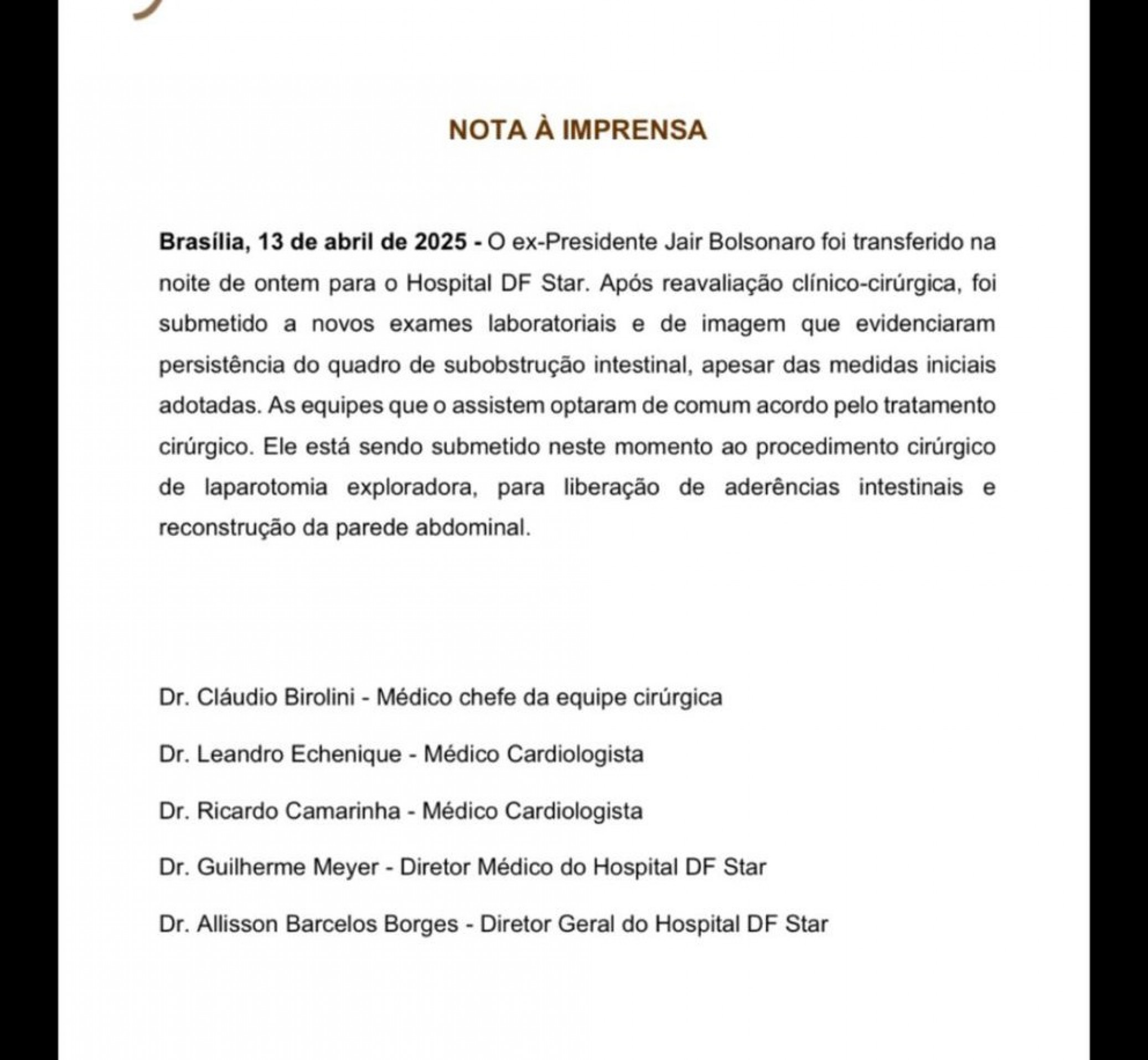 Bolsonaro está sendo submetido a um procedimento cirúrgico chamado laparotomia exploradora, que começou por volta das 10h, após o período de preparo pré-operatório realizado entre 9h e 10h. A cirurgia visa a liberar as aderências e reconstruir a parede abdominal do paciente.