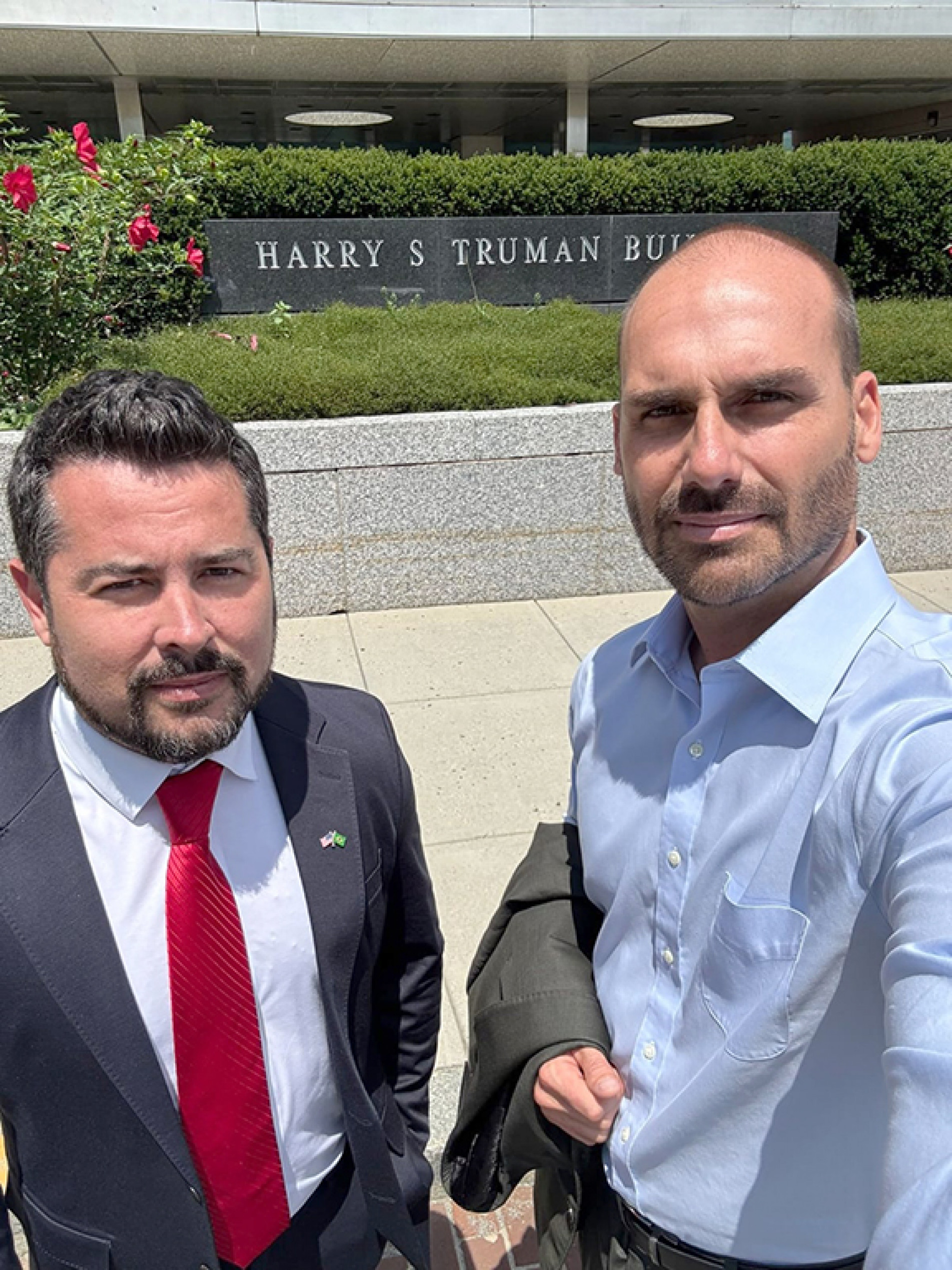 O deputado federal licenciado Eduardo Bolsonaro (PL-SP) publicou no sábado (19) uma foto na rede social X/Twitter posando ao lado do “chefe dos embaixadores” dos Estados Unidos. Sem detalhar nome ou cargo do homem, Eduardo fez referência ao fato de Jair Bolsonaro estar impedido de falar com embaixadores e cita o ministro do Supremo Tribunal Federal (STF), Alexandre de Moraes.