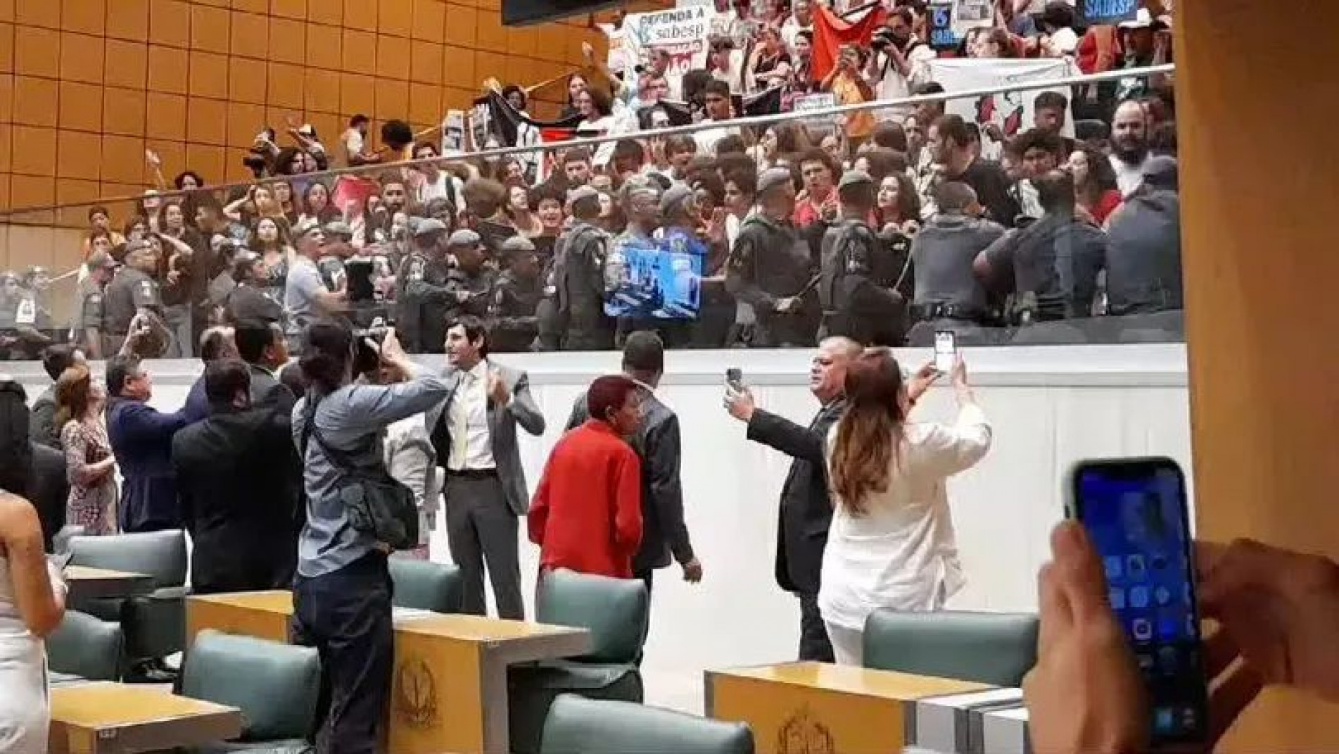 Deputados da oposição disseram que haveria cerceamento da atividade parlamentar se o presidente da Casa, André do Prado (PL-SP), insistisse na continuidade dos debates. Manifestantes contra a privatização forçaram um vidro que separa o plenário da plateia e tentaram invadir o local. Para contê-los, agentes da PM usaram gás pimenta. A substância se espalhou por todo o plenário e fez deputados esvaziarem o local às pressas.
