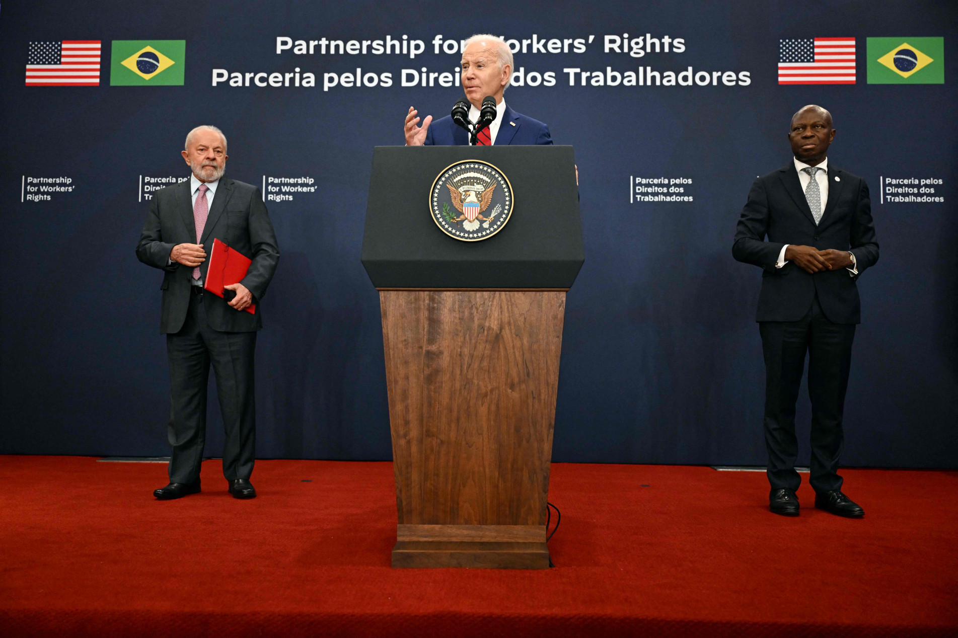 “As duas maiores democracias do hemisfério ocidental estão defendendo os direitos humanos ao redor do mundo”, disse o presidente americano, durante o encontro bilateral com Lula às margens da Assembleia Geral da ONU, em Nova York. “Isso inclui os direitos dos trabalhadores e estou honrado por lançarmos uma nova parceria”, acrescentou o americano.