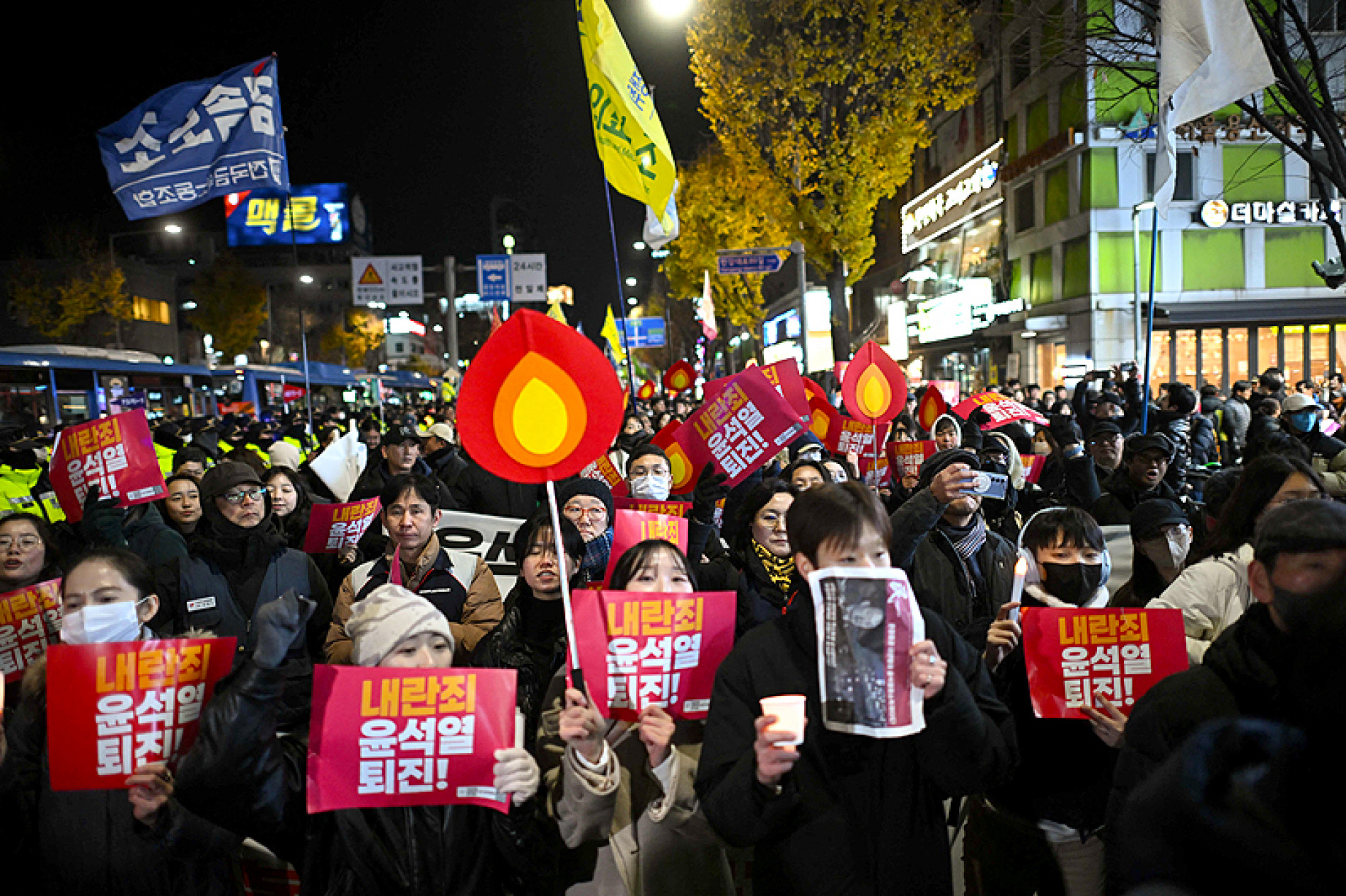 Milhares de pessoas caminharam ontem (4) em direção ao parlamento da Coreia do Sul para apoiar o pedido da oposição para destituir o presidente Yoon Suk Yeol, que impôs a lei marcial durante algumas horas e provocou uma crise política.