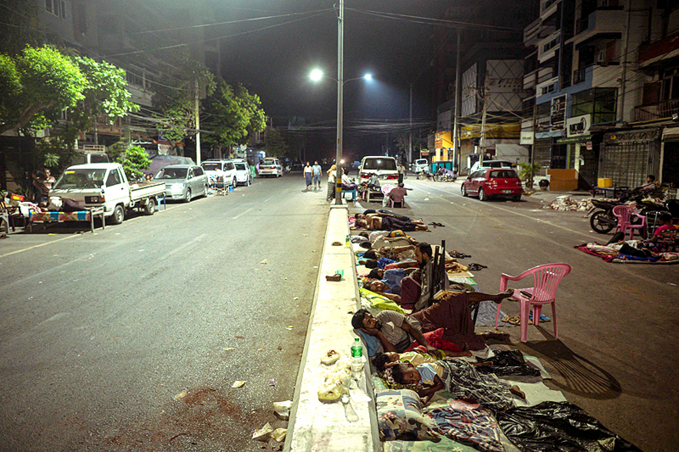 O hospital geral de Mandalay, com capacidade de mil leitos, foi evacuado e centenas de pacientes recebem tratamento do lado de fora. Macas foram colocadas no estacionamento do centro médico, a maioria com apenas uma lona fina para protegê-los do sol tropical.