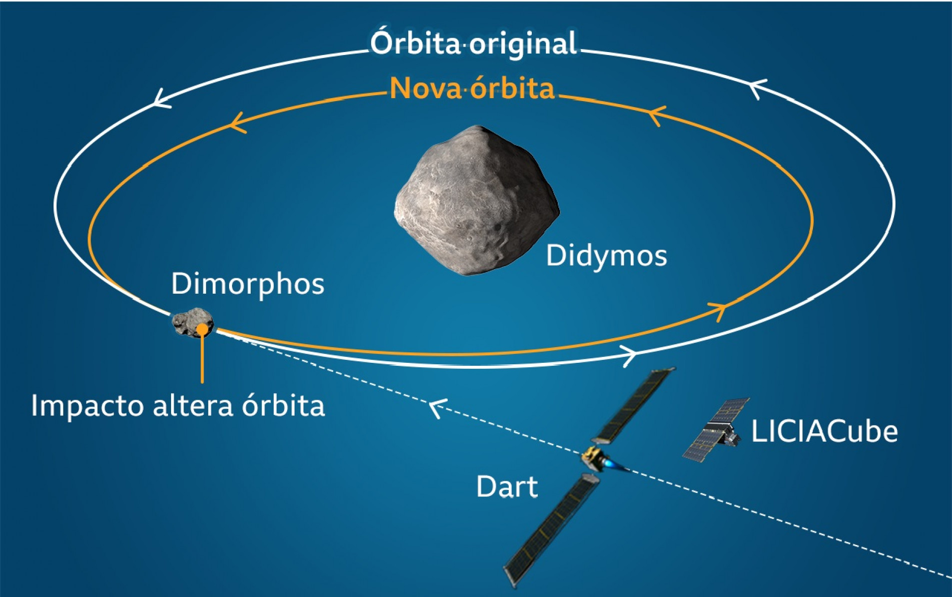 A missão Double Asteroid Redirection Test (Dart), da Nasa, foi lançada com o intuito de colidir com um asteroide chamado Dimorphos, de 160 metros de comprimento.