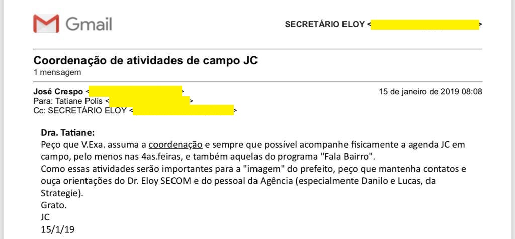 E-mails atribuídos ao prefeito José Crespo (DEM), ao ex-secretário Eloy de Oliveira e a ex-assessora e ex-voluntária da Prefeitura de Sorocaba, Tatiane Polis, mostram como foi o trabalho dela no Executivo, inclusive com as atribuições, dadas diretamente pelo prefeito. Os documentos mostram até atritos entre Tatiane Polis e Oliveira, e que ela participava de reuniões na Prefeitura.
