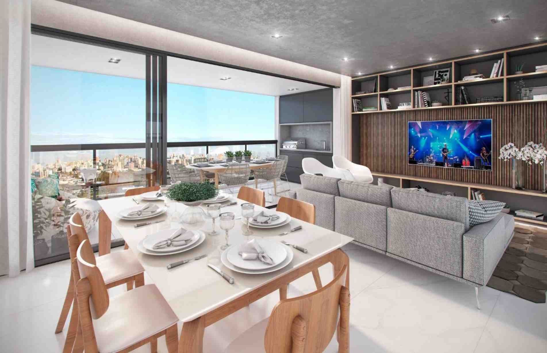 O acabamento também foi uma das prioridades. Há porcelanato nas áreas sociais e úmidas e também infraestrutura para coifa na Varanda Gourmet. Aliás, nesse espaço destinado à convivência, a Varanda Gourmet já vem com churrasqueira a gás. Um outro diferencial é que o Living também possui lavabo. E isso sem falar em toda a estrutura da área social.