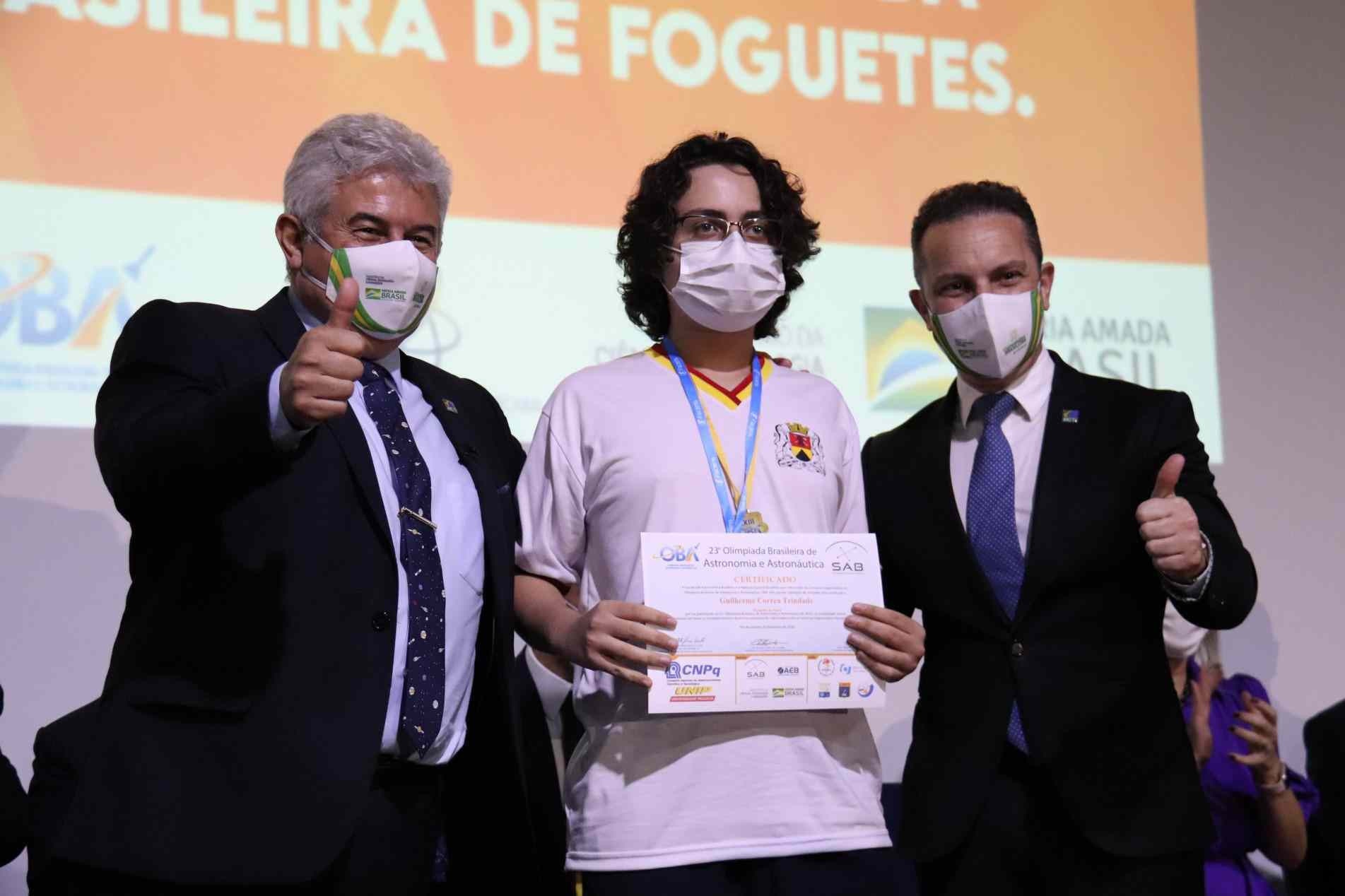 O estudante Guilherme Corrêa Trindade, 14 anos, é aluno do 9º ano da escola municipal Matheus Maylasky e ganhou medalha de ouro na 23ª edição da OBA. Ele e outros dois colegas da mesma escola municipal estão entre os quatro que foram homenageados na cerimônia com a presença do presidente Jair Bolsonaro e o ministro Marcos Pontes.