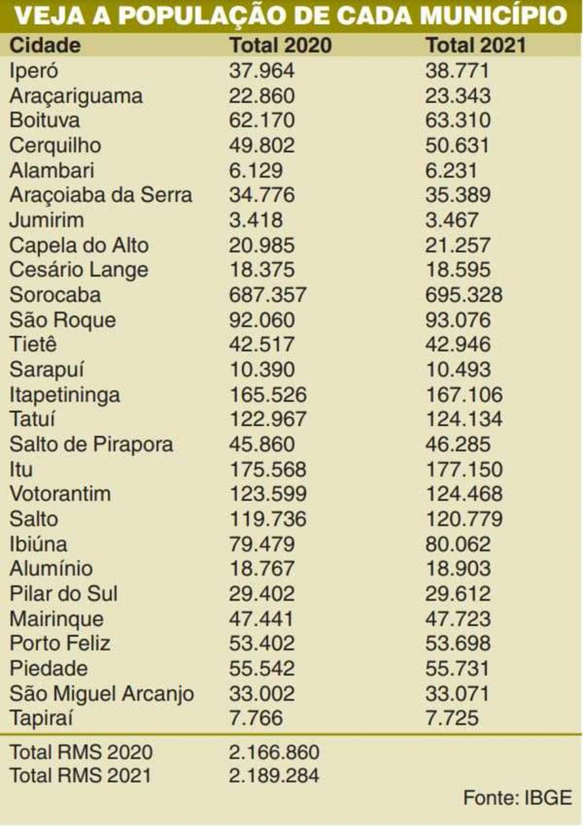 Em 2020, Itapetininga tinha 165.526 habitantes e em um ano ganhou mais 1.580. Votorantim tinha 123.599 habitantes e este ano passou para 124.468, com 869 novos moradores. Tatuí tinha 122.967 moradores em 2020 e em 2021 passou para 124.134, mais 1.167 pessoas.