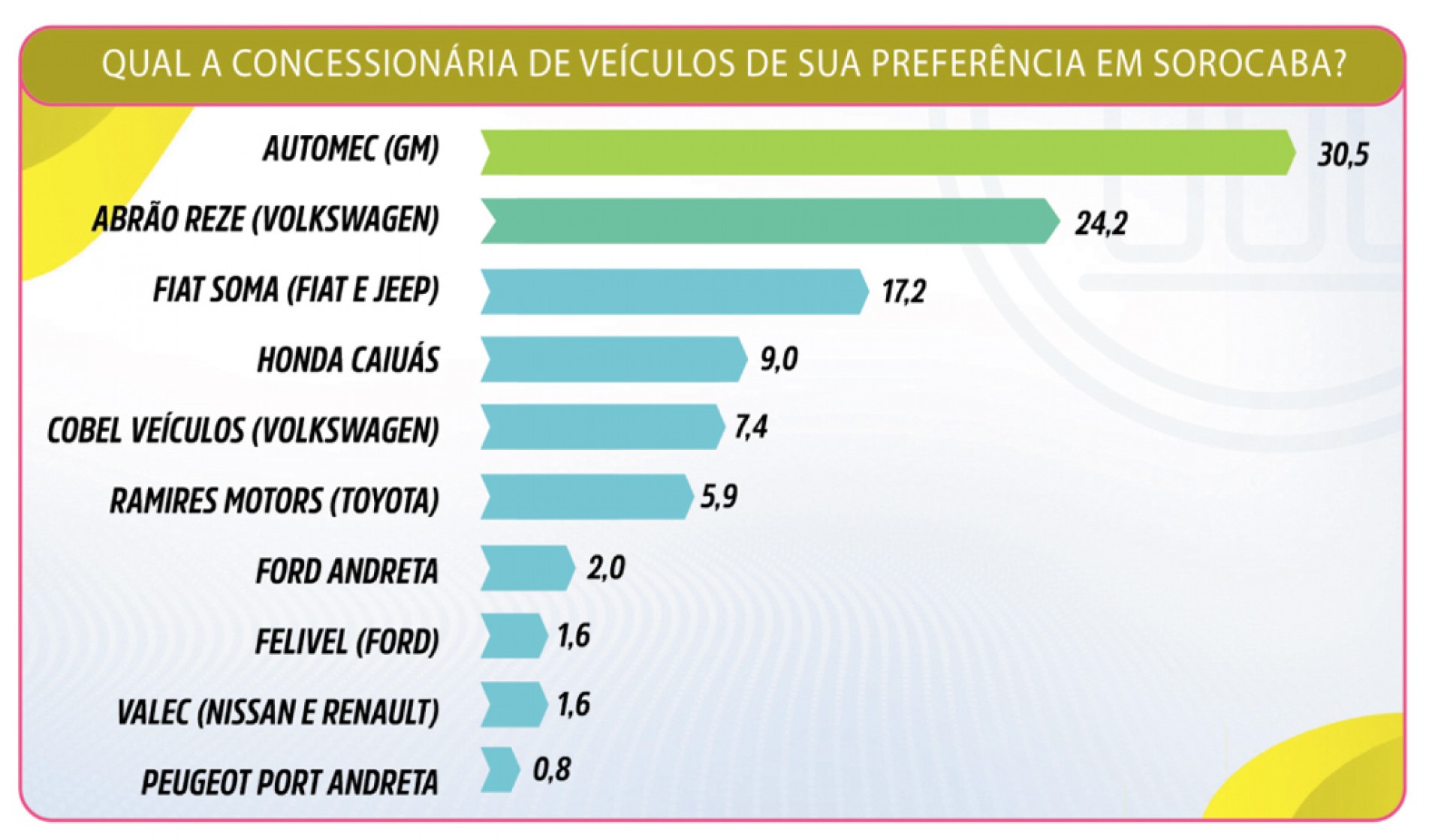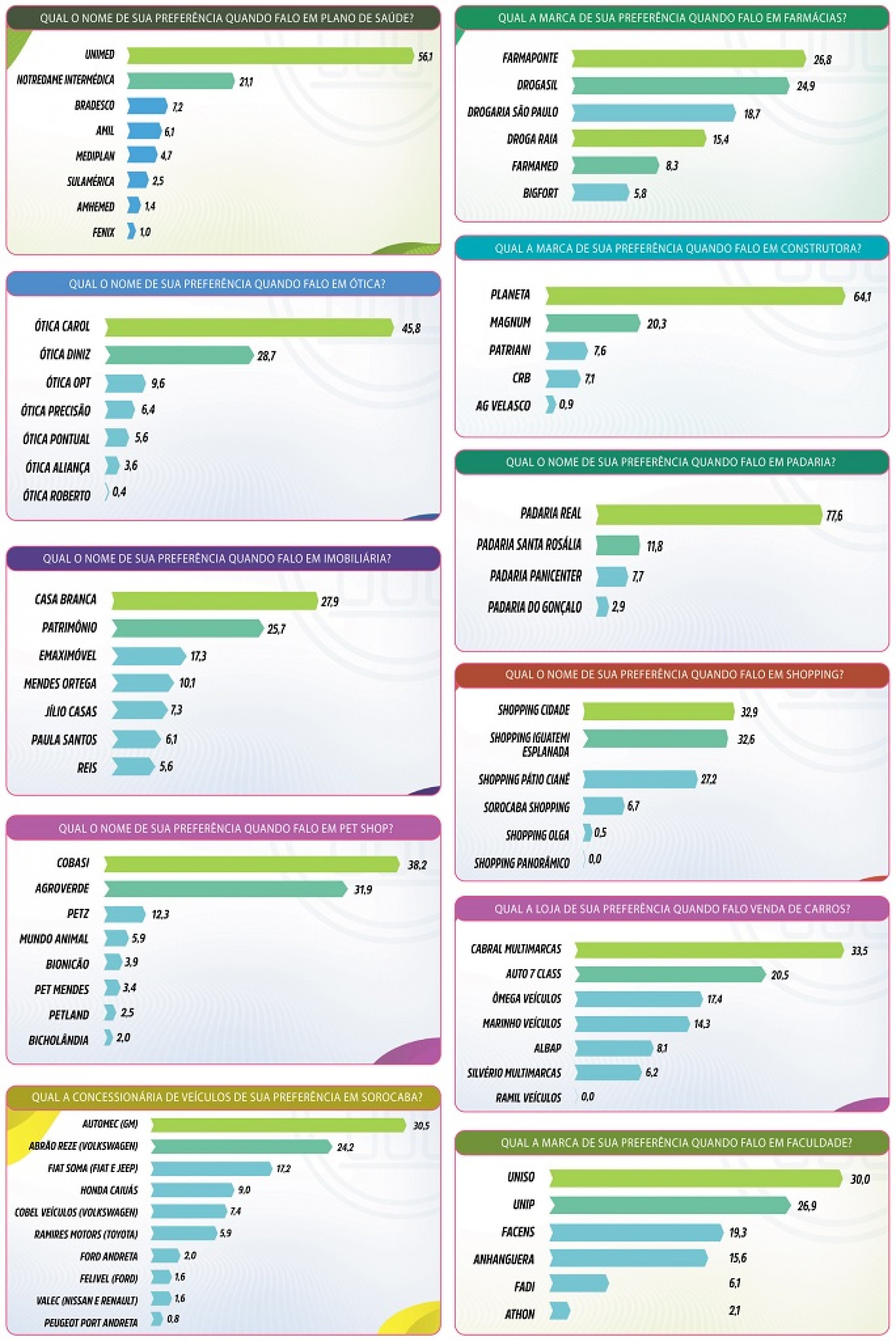 Um avaliou os Poderes Executivo e Legislativo e a administração municipal, com julgamento de quatro serviços (saúde, segurança, transporte e educação). Outro mostrou as marcas mais lembradas pelos sorocabanos em 11 segmentos. Confira todas as empresas citadas abaixo.