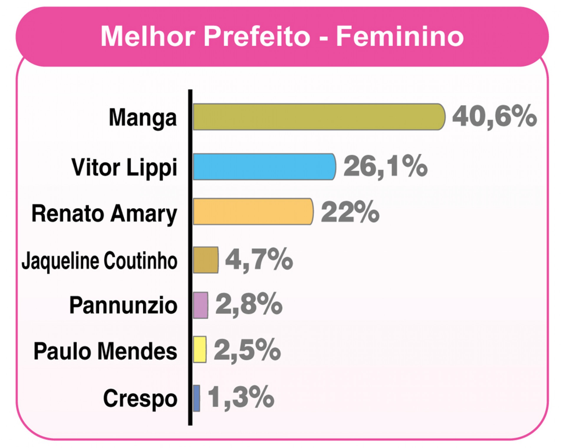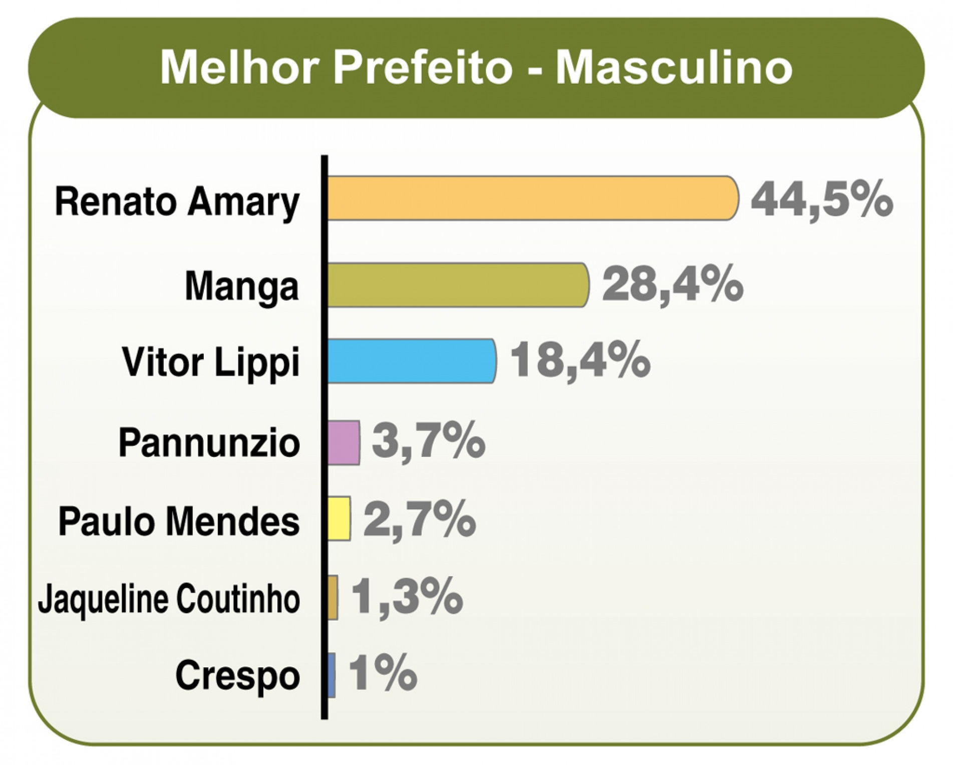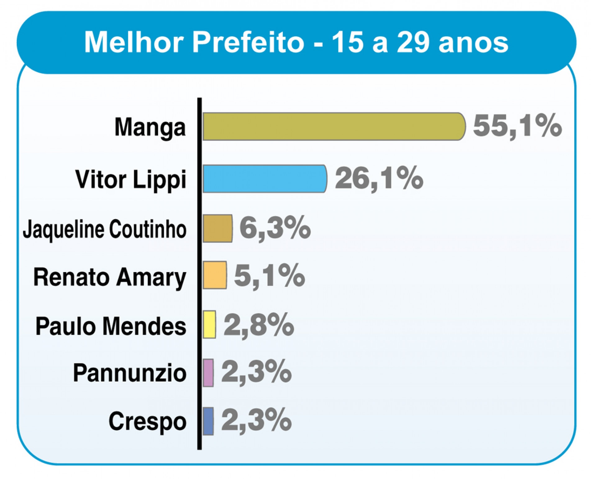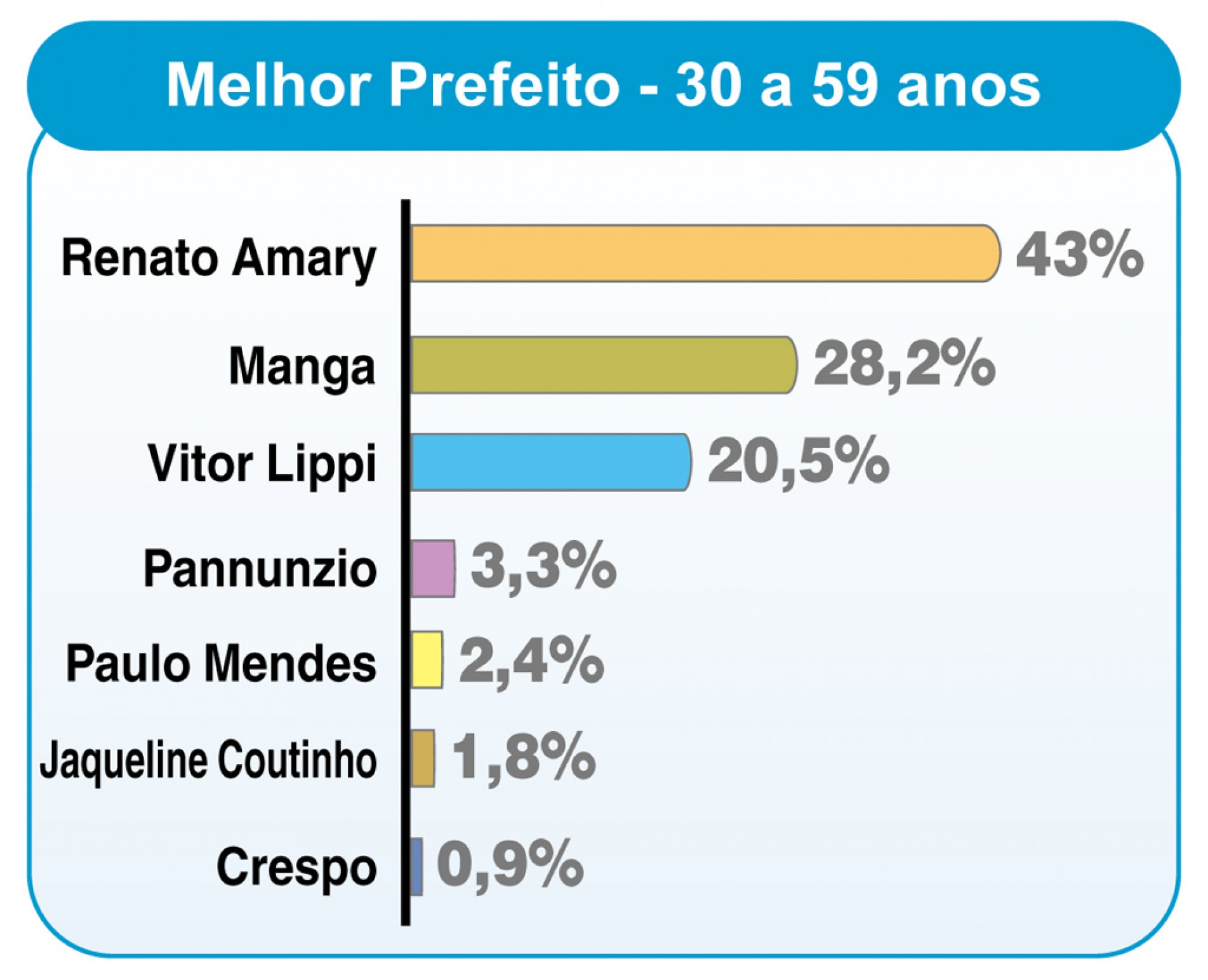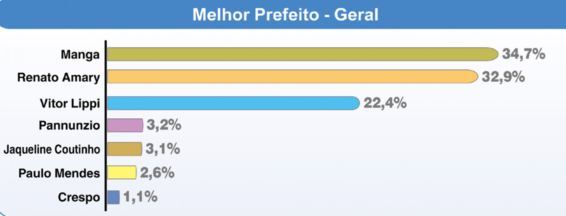 Nos gráficos, os dados da pesquisa são mostrados em três vertentes: por gênero, idade e região da cidade. Atual prefeito Rodrigo Manga e ex-prefeito Renato Amary dividem a preferência